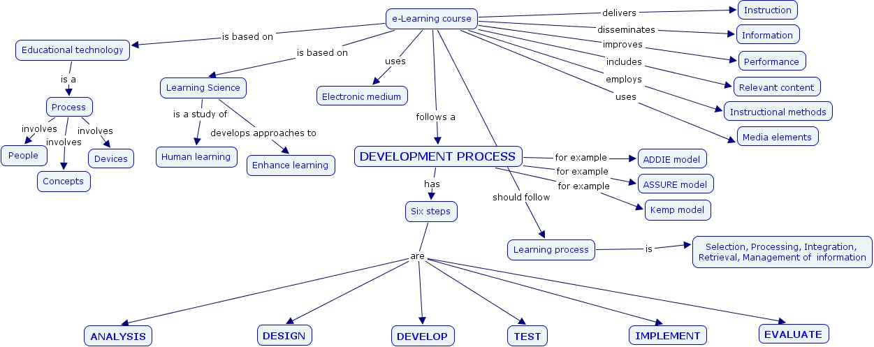 Deepak Kumar, DEVELOPMENT PROCESS for example ADDIE model, Process involves Devices, Process involves People, e-Learning course is based on Educational technology, e-Learning course uses Electronic medium, Six steps are TEST, e-Learning course improves Performance, e-Learning course is based on Learning Science, Learning Science develops approaches to Enhance learning, Process involves Concepts
