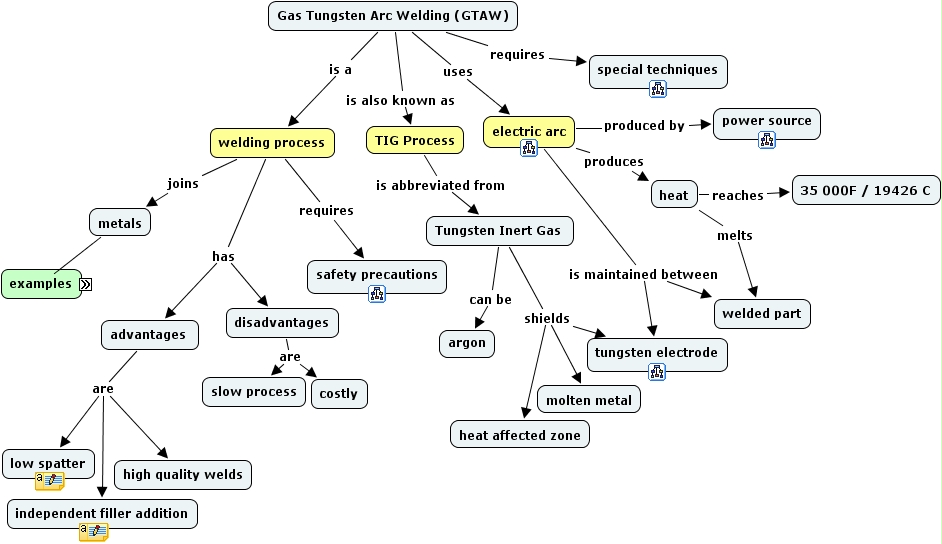 Gas Tungsten Arc Welding (GTAW) requires special techniques, Gas Tungsten Arc Welding (GTAW) is also known as TIG Process, heat reaches 35 000F / 19426 C, electric arc produces heat, Gas Tungsten Arc Welding (GTAW) uses electric arc, electric arc produced by power source, welding process requires safety precautions, advantages are low spatter, advantages are high quality welds, advantages are independent filler addition, electric arc is maintained between welded part, electric arc is maintained between tungsten electrode, aluminium is the most popular, Tungsten Inert Gas can be argon, Gas Tungsten Arc Welding (GTAW) is a welding process, welding process joins metals, TIG Process is abbreviated from Tungsten Inert Gas, welding process has advantages, welding process has disadvantages, heat melts welded part, Tungsten Inert Gas shields heat affected zone, Tungsten Inert Gas shields molten metal, Tungsten Inert Gas shields tungsten electrode, metals can be copper, metals can be gold, metals can be nickel alloys, metals can be stainless steel, metals can be magnesium, metals can be bronze, metals can be aluminium, metals can be brass, metals can be titanium, disadvantages are slow process, disadvantages are costly
