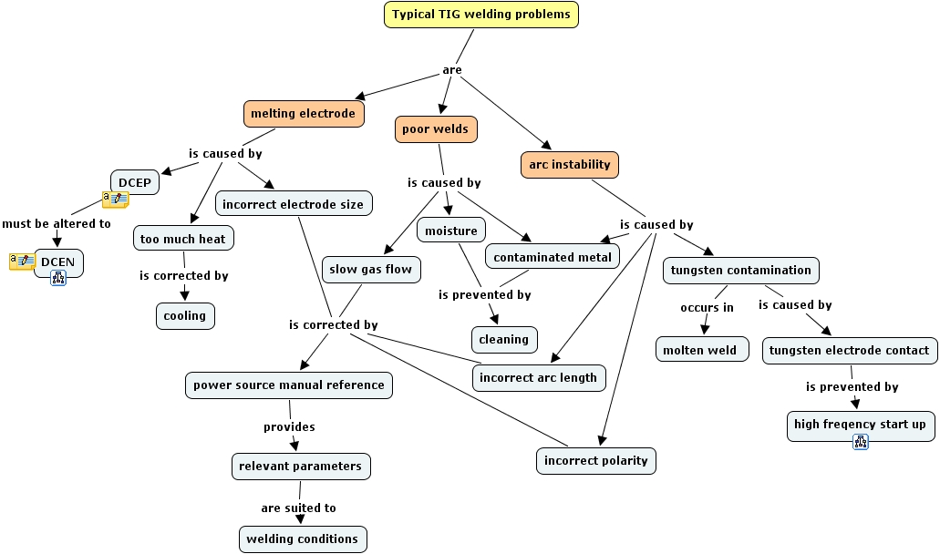 power source manual reference provides relevant parameters, melting electrode is caused by DCEP, melting electrode is caused by incorrect electrode size, melting electrode is caused by too much heat, tungsten contamination is caused by tungsten electrode contact, Typical TIG welding problems are poor welds, Typical TIG welding problems are melting electrode, Typical TIG welding problems are arc instability, DCEP must be altered to DCEN, tungsten electrode contact is prevented by high freqency start up, moisture is prevented by cleaning, poor welds is caused by slow gas flow, poor welds is caused by moisture, poor welds is caused by contaminated metal, relevant parameters are suited to welding conditions, slow gas flow is corrected by power source manual reference, incorrect electrode size is corrected by power source manual reference, contaminated metal is prevented by cleaning, incorrect polarity is corrected by power source manual reference, arc instability is caused by incorrect polarity, arc instability is caused by tungsten contamination, arc instability is caused by incorrect arc length, arc instability is caused by contaminated metal, incorrect arc length is corrected by power source manual reference, too much heat is corrected by cooling, tungsten contamination occurs in molten weld