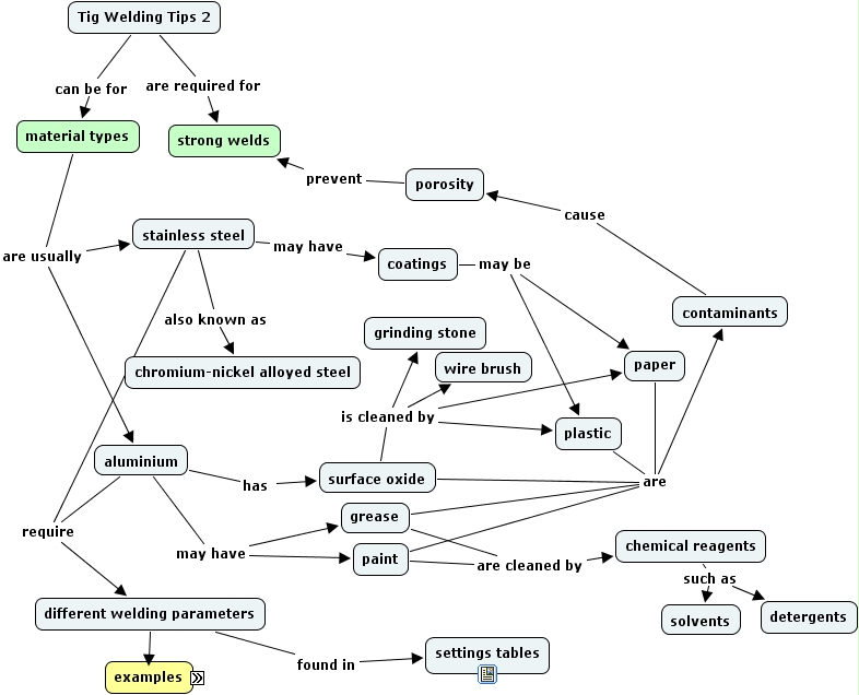 Tig Welding Tips 2 can be for material types, paint are contaminants, surface oxide are contaminants, grease are contaminants, aluminium may have paint, aluminium may have grease, different welding parameters found in settings tables, aluminium has surface oxide, chemical reagents such as detergents, chemical reagents such as solvents, porosity prevent strong welds, paper are contaminants, contaminants cause porosity, stainless steel may have coatings, material types are usually aluminium, material types are usually stainless steel, surface oxide is cleaned by plastic, surface oxide is cleaned by wire brush, surface oxide is cleaned by paper, surface oxide is cleaned by grinding stone, stainless steel require different welding parameters, Tig Welding Tips 2 are required for strong welds, different welding parameters such as gas, different welding parameters such as electrode type, different welding parameters such as metal thickness, different welding parameters such as current, different welding parameters such as joint, aluminium require different welding parameters, coatings may be plastic, coatings may be paper, grease are cleaned by chemical reagents, stainless steel also known as chromium-nickel alloyed steel, plastic are contaminants, paint are cleaned by chemical reagents