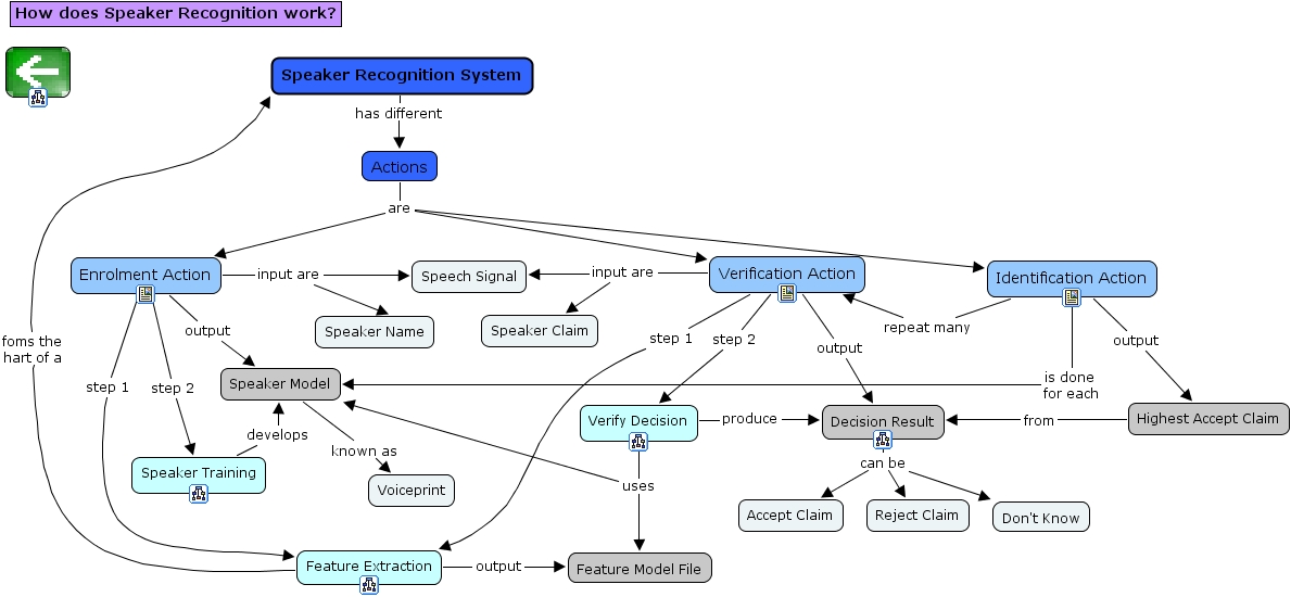 2.1 How Speaker Recognition work, Enrolment Action input are Speaker Name, Verification Action step 1 Feature Extraction, Identification Action is done for each Speaker Model, Enrolment Action input are Speech Signal, Speaker Training develops Speaker Model, Feature Extraction output Feature Model File, Enrolment Action step 1 Feature Extraction, Verify Decision uses Speaker Model, Enrolment Action output Speaker Model, Actions are Enrolment Action