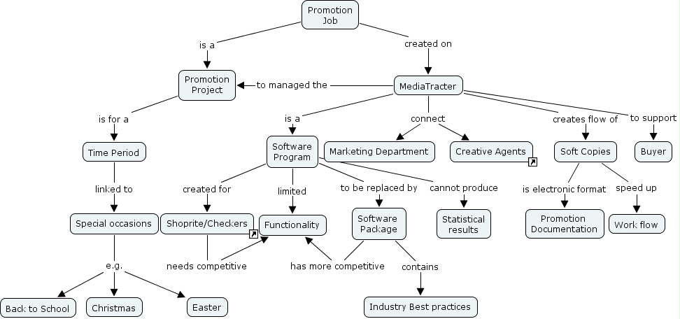 c2-Promotion Job, MediaTracter is a Software Program, Shoprite/Checkers needs competitive Functionality, Special occasions e.g. Christmas, Software Program to be replaced by Software Package, Soft Copies speed up Work flow, Software Package has more competitive Functionality, MediaTracter connect Marketing Department, Time Period linked to Special occasions, MediaTracter to managed the Promotion Project, Software Package contains Industry Best practices