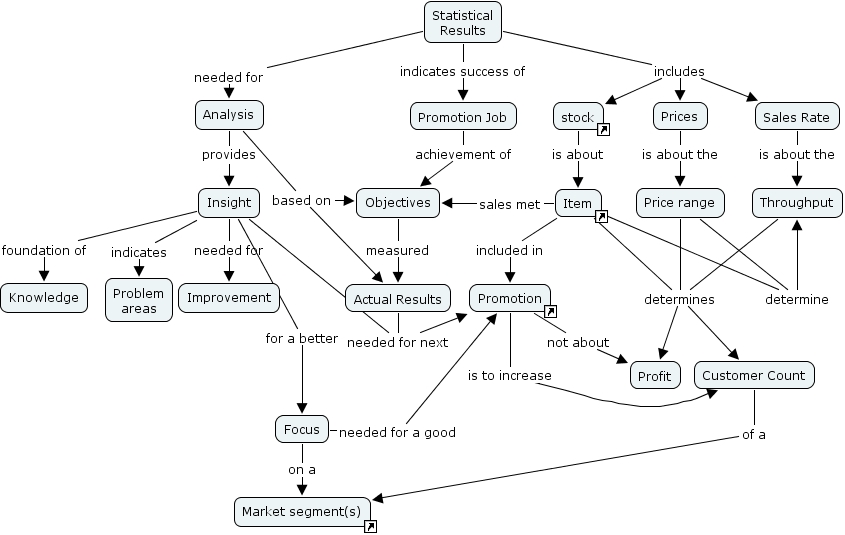 d2-Stats, Item sales met Objectives, Objectives measured Actual Results, Insight needed for Improvement, stock is about Item, Statistical Results includes stock, Analysis based on Actual Results, Statistical Results needed for Analysis, Item included in Promotion, Promotion is to increase Customer Count, Analysis based on Objectives