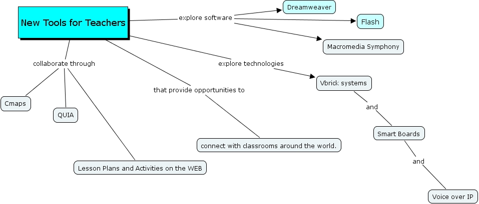 New Tools for Teachers, New Tools for Teachers collaborate through QUIA, New Tools for Teachers explore software Flash, Smart Boards and Voice over IP, New Tools for Teachers explore software Dreamweaver, New Tools for Teachers collaborate through Cmaps, New Tools for Teachers explore software Macromedia Symphony, New Tools for Teachers explore technologies Vbrick systems, New Tools for Teachers that provide opportunities to connect with classrooms around the world., New Tools for Teachers collaborate through Lesson Plans and Activities on the WEB, Vbrick systems and Smart Boards