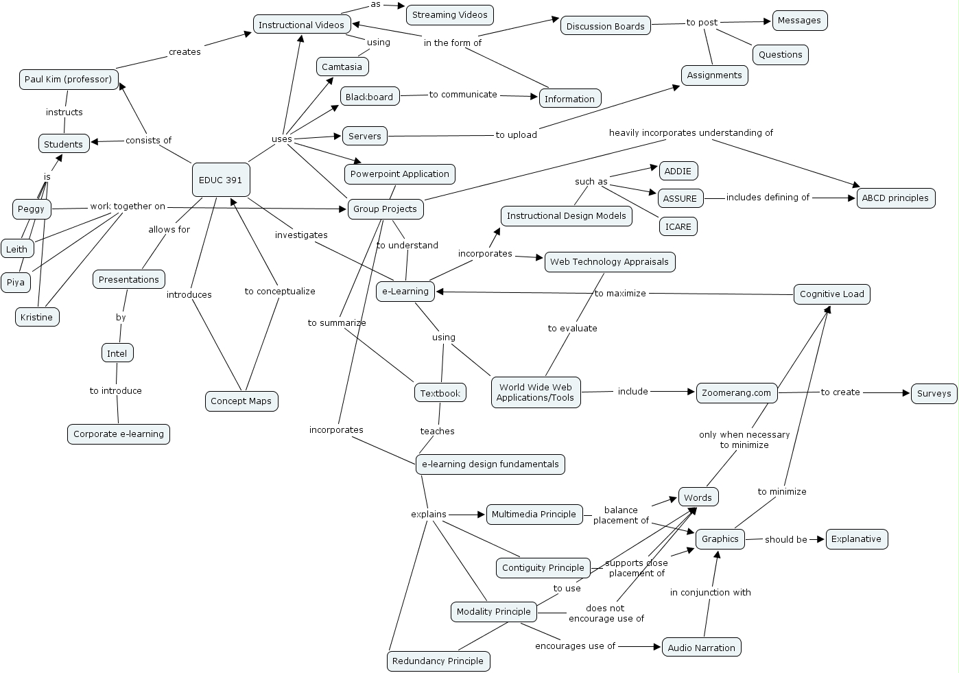 Peggy Chung, EDUC 391 allows for Presentations, EDUC 391 uses Camtasia, World Wide Web Applications/Tools include Zoomerang.com, EDUC 391 consists of Paul Kim (professor), Web Technology Appraisals to evaluate World Wide Web Applications/Tools, Presentations by Intel, EDUC 391 uses Powerpoint Application, Kristine work together on Group Projects, Modality Principle does not encourage use of Words, Leith work together on Group Projects