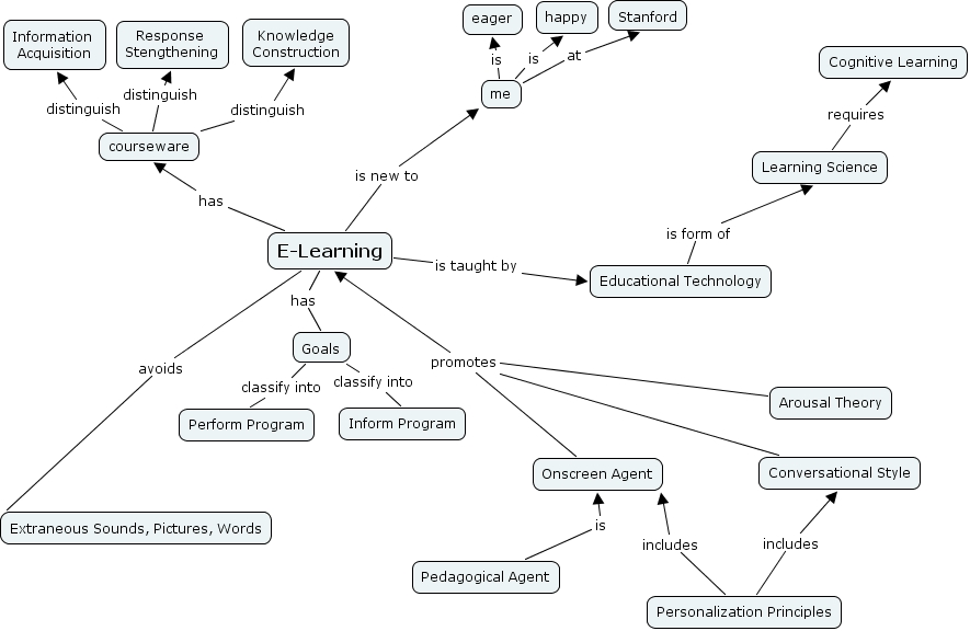 Sun-Young Map, Pedagogical Agent is Onscreen Agent, E-Learning has Goals, Goals classify into Inform Program, Personalization Principles includes Onscreen Agent, Educational Technology is form of Learning Science, E-Learning is new to me, Personalization Principles includes Conversational Style, me at Stanford, courseware distinguish Response Stengthening, courseware distinguish Knowledge Construction