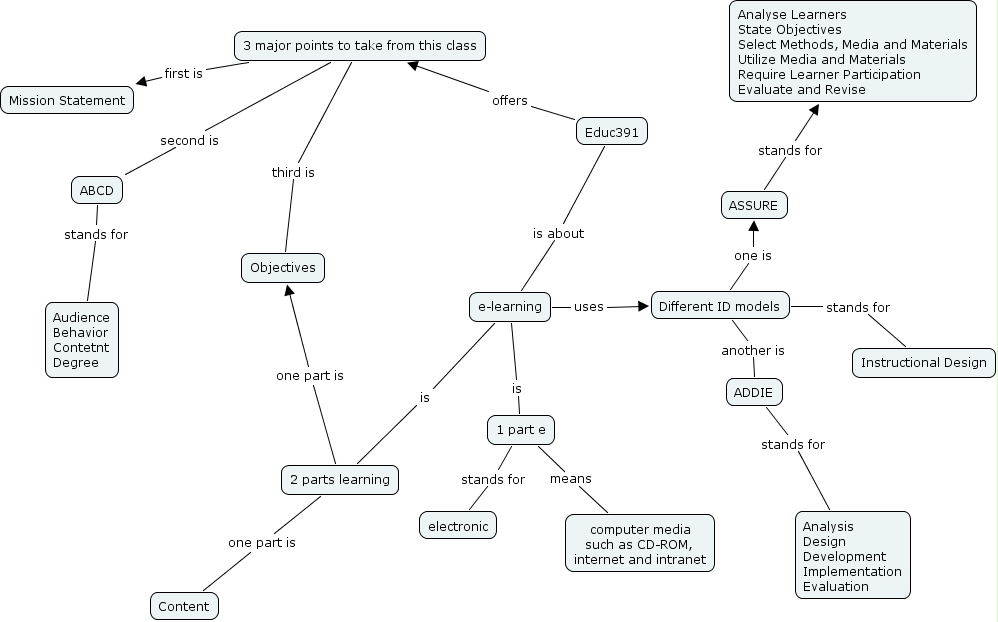 Sara Kalantari wk2, e-learning is 1 part e, Different ID models one is ASSURE, Educ391 is about e-learning, 1 part e means computer media such as CD-ROM, internet and intranet, Different ID models stands for Instructional Design, 2 parts learning one part is Content, e-learning uses Different ID models, e-learning is 2 parts learning, 3 major points to take from this class third is Objectives, e-learning is 2 parts learning