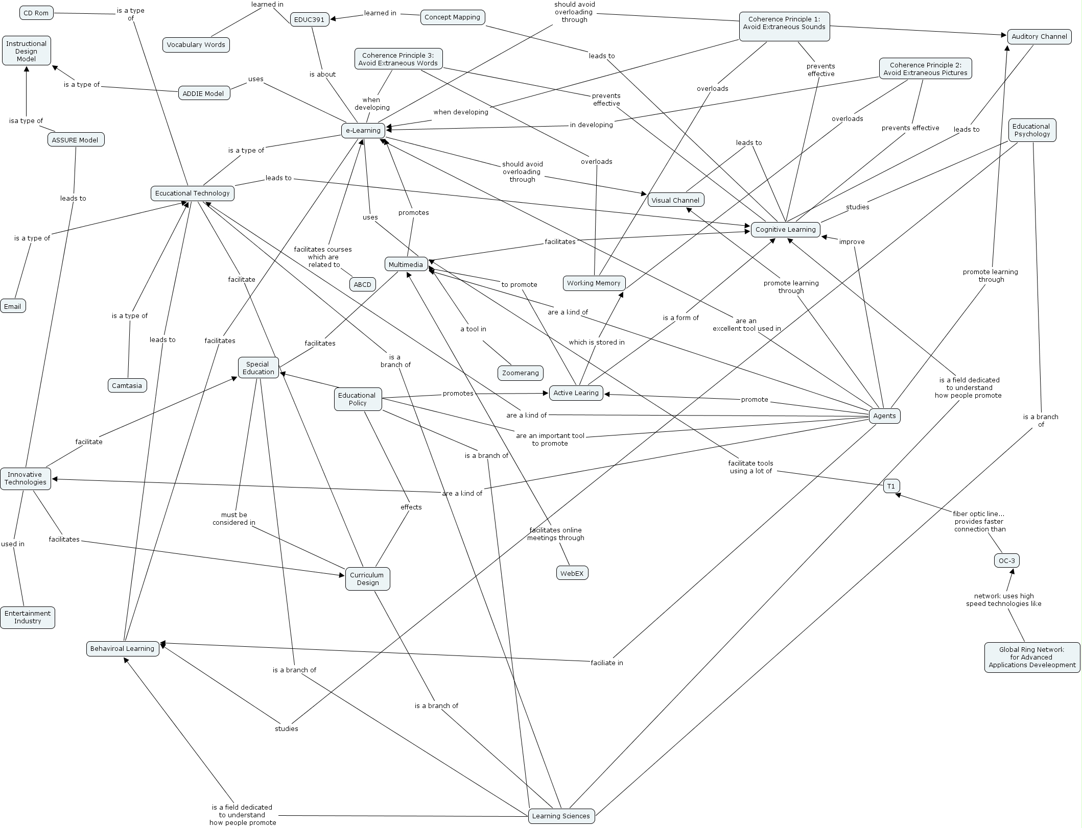 Piya Sorcar - Week 5, Agents are an excellent tool used in e-Learning, Email is a type of Ecucational Technology, Ecucational Technology leads to Cognitive Learning, Educational Psychology studies Cognitive Learning, Educational Policy promotes Active Learing, Multimedia promotes e-Learning, Educational Psychology studies Behaviroal Learning, Multimedia to promote Active Learing, Agents are an important tool to promote Special Education, Agents promote learning through Auditory Channel
