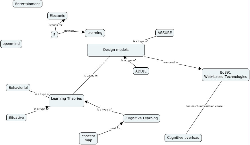 This Concept Map, created with IHMC CmapTools, has information related to: Dahwun Kim wk2, Situative is a type of Learning Theories, E stands for Electonic, ASSURE is a type of Design models, ADDIE is a type of Design models, Design models is based on Learning Theories, Ed391 Web-based Technologies too much information cause Cognitive overload, concept map used for Cognitive Learning, Design models are used in Ed391 Web-based Technologies, E defined Learning, Situative is a type of Learning Theories, Behaviorial is a type of Learning Theories, Cognitive Learning is a type of Learning Theories