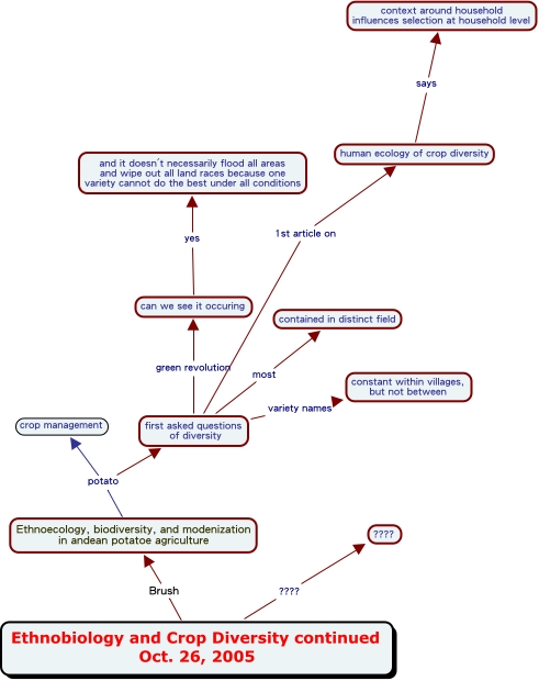 This Concept Map, created with IHMC CmapTools, has information related to: ECL 222 Oct 26, first asked questions of diversity 1st article on human ecology of crop diversity, Ethnobiology and Crop Diversity continued Oct. 26, 2005 ???? ????, Ethnobiology and Crop Diversity continued Oct. 26, 2005 Brush Ethnoecology, biodiversity, and modenization in andean potatoe agriculture, first asked questions of diversity variety names constant within villages, but not between, Ethnoecology, biodiversity, and modenization in andean potatoe agriculture potato first asked questions of diversity, Ethnoecology, biodiversity, and modenization in andean potatoe agriculture potato crop management, human ecology of crop diversity says context around household influences selection at household level, first asked questions of diversity most contained in distinct field, can we see it occuring yes and it doesn't necessarily flood all areas and wipe out all land races because one variety cannot do the best under all conditions, first asked questions of diversity green revolution can we see it occuring