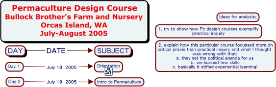 This Concept Map, created with IHMC CmapTools, has information related to: PDC bullock master, Day 2 July 19, 2005 Intro to Permaculture, Day 1 July 18, 2005 Orientation, DAY DATE SUBJECT