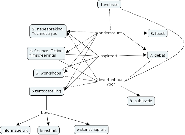 Project onderdelen, 4. Science Fiction filmscreenings inspireert 2. nabespreking Technocalyps, 5. workshops inspireert 7. debat, 6 tentoostelling bevat informatieluik, 7. debat levert inhoud voor 8. publicatie, 1.website ondersteunt 3. feest, 5. workshops levert inhoud voor 8. publicatie, 6 tentoostelling bevat kunstluik, 6 tentoostelling levert inhoud voor 8. publicatie, 1.website levert inhoud voor 2. nabespreking Technocalyps, 1.website ondersteunt 5. workshops
