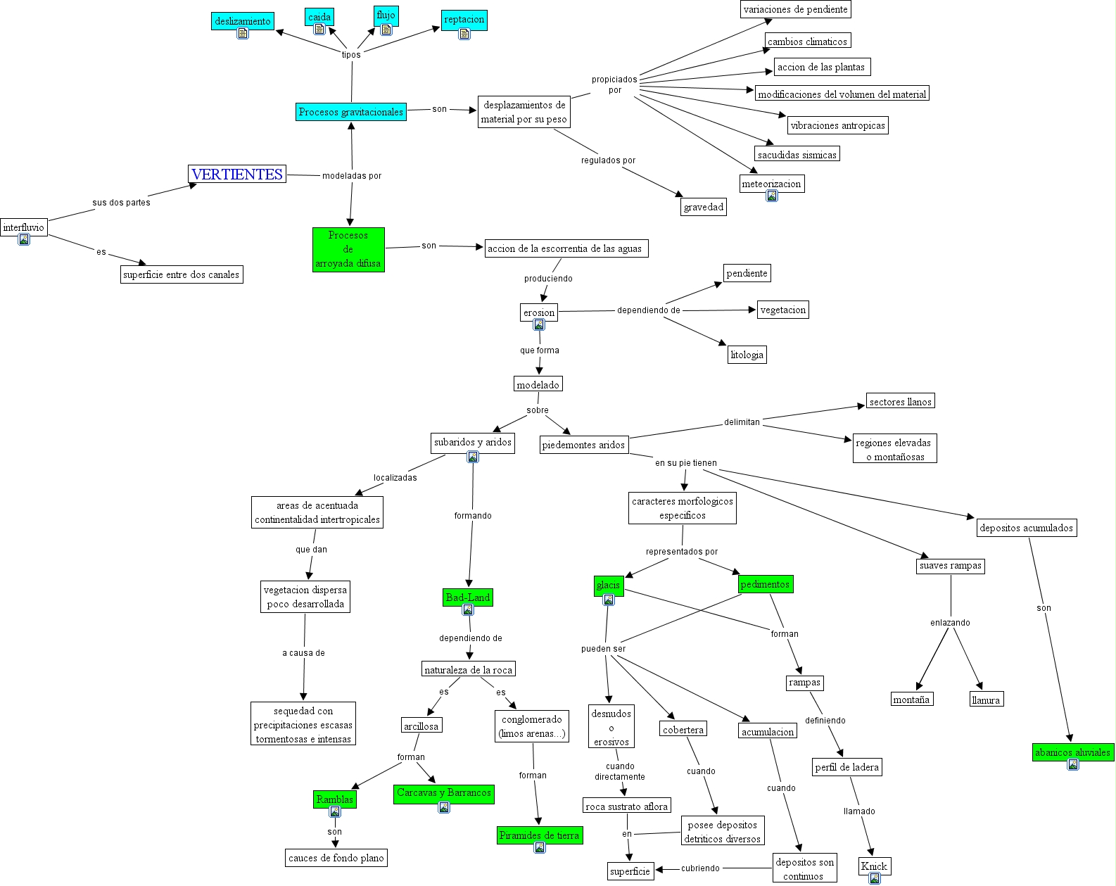 vertientes, desplazamientos de material por su peso regulados por gravedad, desnudos o erosivos cuando directamente roca sustrato aflora, VERTIENTES modeladas por Procesos de arroyada difusa, pedimentos pueden ser cobertera, piedemontes aridos en su pie tienen depositos acumulados, desplazamientos de material por su peso propiciados por modificaciones del volumen del material, Procesos gravitacionales tipos reptacion, caracteres morfologicos especificos representados por glacis, arcillosa forman Ramblas, desplazamientos de material por su peso propiciados por vibraciones antropicas