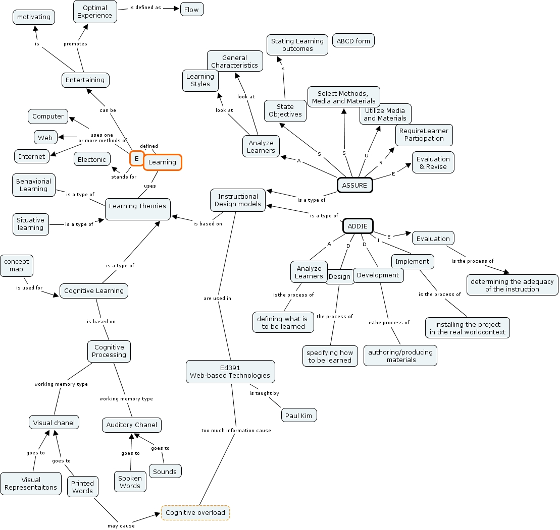dahwunkim_wk5, ADDIE is a type of Instructional Design models, Situative learning is a type of Learning Theories, Cognitive Learning is based on Cognitive Processing, Cognitive Learning is a type of Learning Theories, E uses one or more methods of Computer, Evaluation is the process of determining the adequacy of the instruction, ASSURE S State Objectives, E can be Entertaining, ASSURE U Utilize Media and Materials, Development isthe process of authoring/producing materials