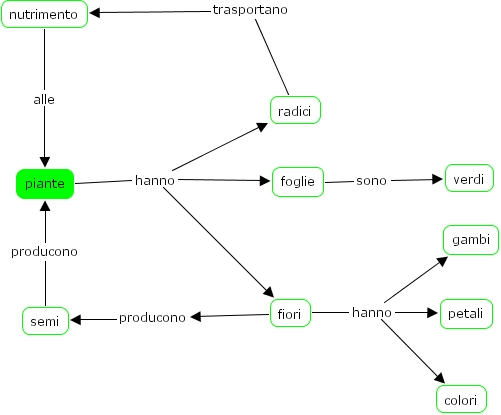 piante hanno radici, piante hanno fiori, piante hanno foglie, radici trasportano nutrimento, fiori hanno gambi, fiori hanno colori, fiori hanno petali, foglie sono verdi, nutrimento alle piante, semi producono piante, fiori producono semi