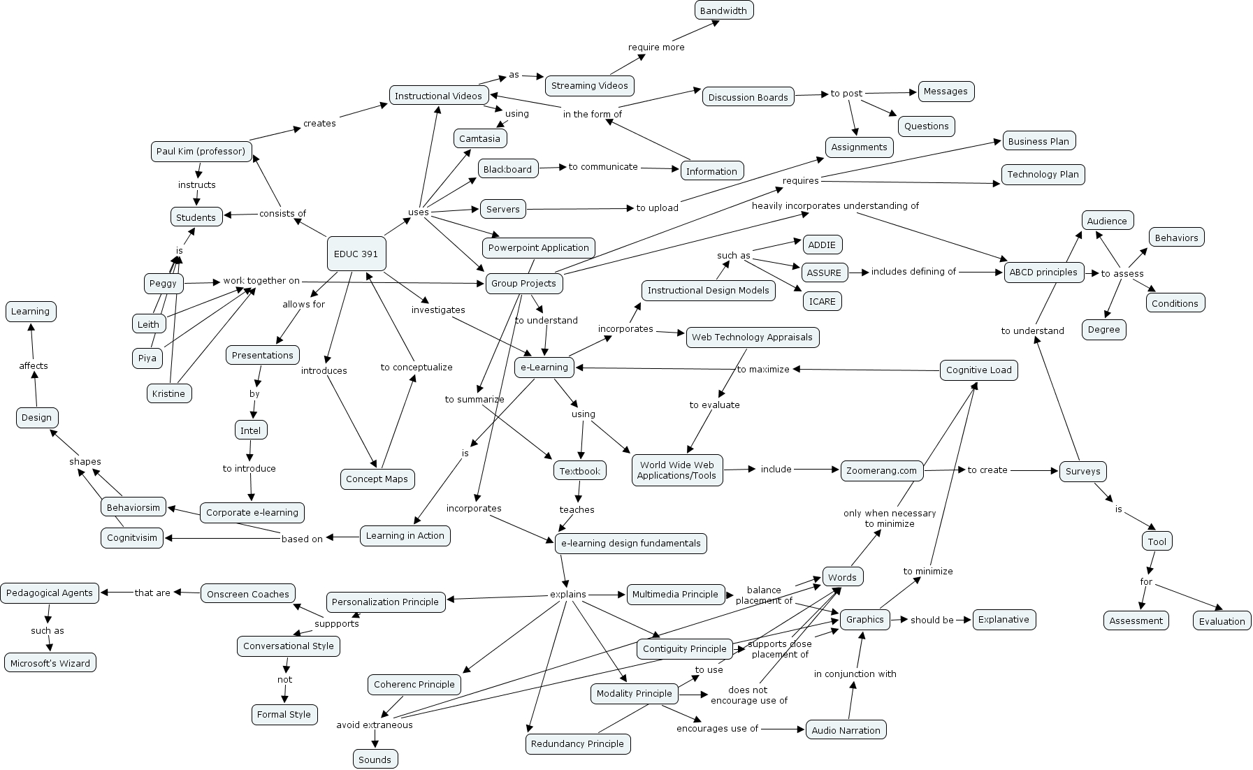 Peggy Chung, Pedagogical Agents such as Microsoft's Wizard, Graphics to minimize Cognitive Load, ABCD principles to assess Audience, Conversational Style not Formal Style, Instructional Design Models such as ICARE, Graphics should be Explanative, Zoomerang.com to create Surveys, e-learning design fundamentals explains Coherenc Principle, Group Projects requires Technology Plan, Instructional Design Models such as ASSURE