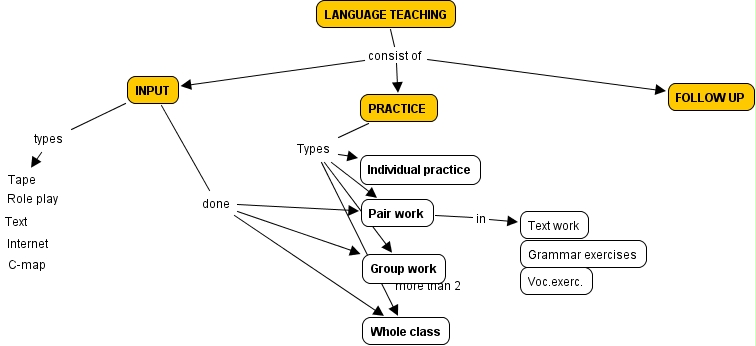 Language teaching, INPUT done Whole class, PRACTICE Types Individual practice, PRACTICE Types Group work, Pair work in Text work, PRACTICE Types Whole class, INPUT done Group work, PRACTICE Types Pair work, LANGUAGE TEACHING consist of INPUT, LANGUAGE TEACHING consist of FOLLOW UP, INPUT types Tape