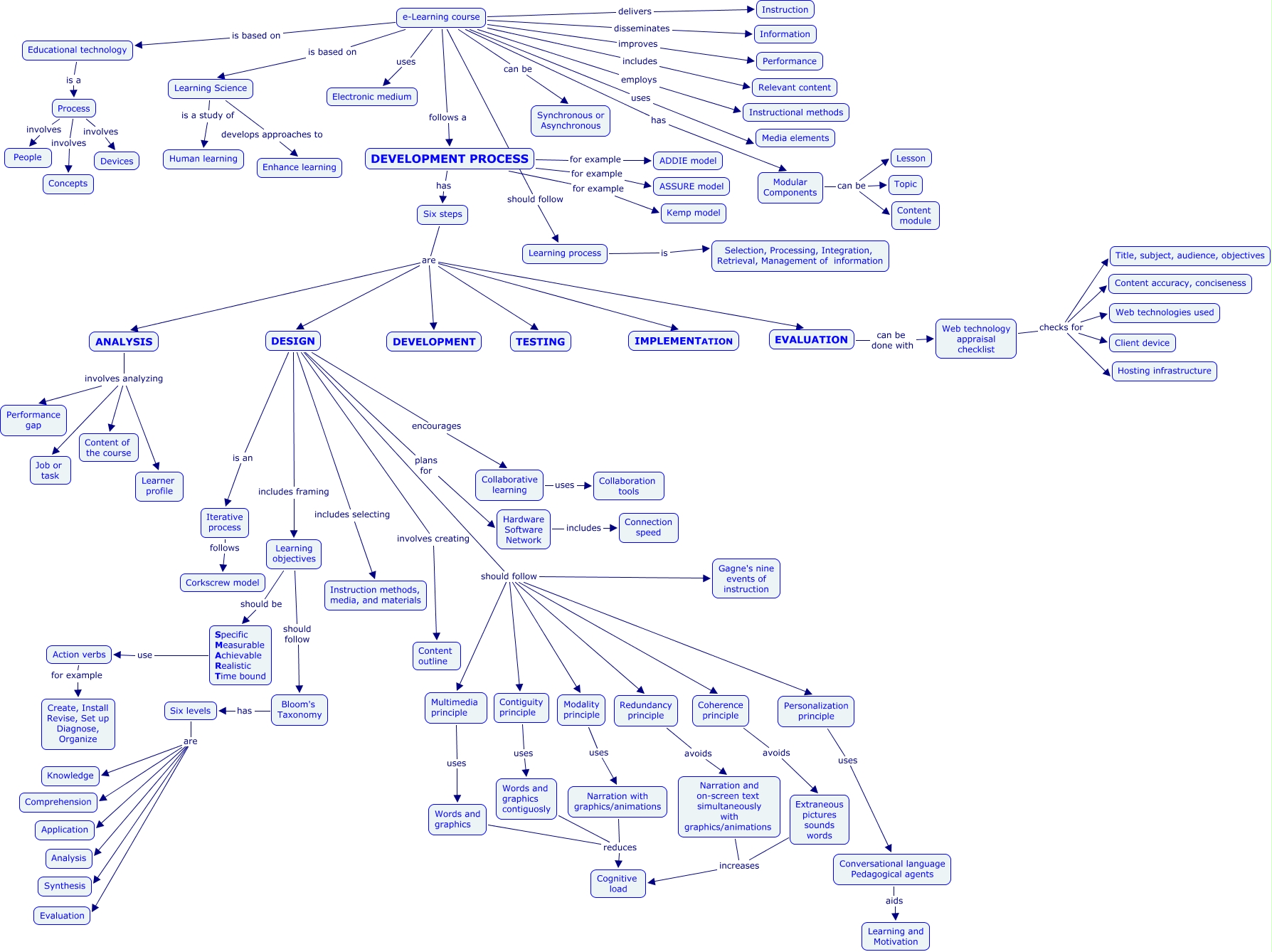 This Concept Map, created with IHMC CmapTools, has information related to: Deepak Kumar, e-Learning course follows a DEVELOPMENT PROCESS, DESIGN should follow Coherence principle, DESIGN encourages Collaborative learning, Hardware Software Network includes Connection speed, e-Learning course is based on Educational technology, Web technology appraisal checklist checks for Content accuracy, conciseness, Collaborative learning uses Collaboration tools, e-Learning course uses Media elements, Web technology appraisal checklist checks for Hosting infrastructure, Six steps are TESTING, Redundancy principle avoids Narration and on-screen text simultaneously with graphics/animations, Learning objectives should follow Bloom's Taxonomy, Conversational language Pedagogical agents aids Learning and Motivation, Narration and on-screen text simultaneously with graphics/animations increases Cognitive load, DESIGN should follow Contiguity principle, Words and graphics contiguosly reduces Cognitive load, DEVELOPMENT PROCESS for example ADDIE model, Iterative process follows Corkscrew model, Extraneous pictures sounds words increases Cognitive load, Modality principle uses Narration with graphics/animations