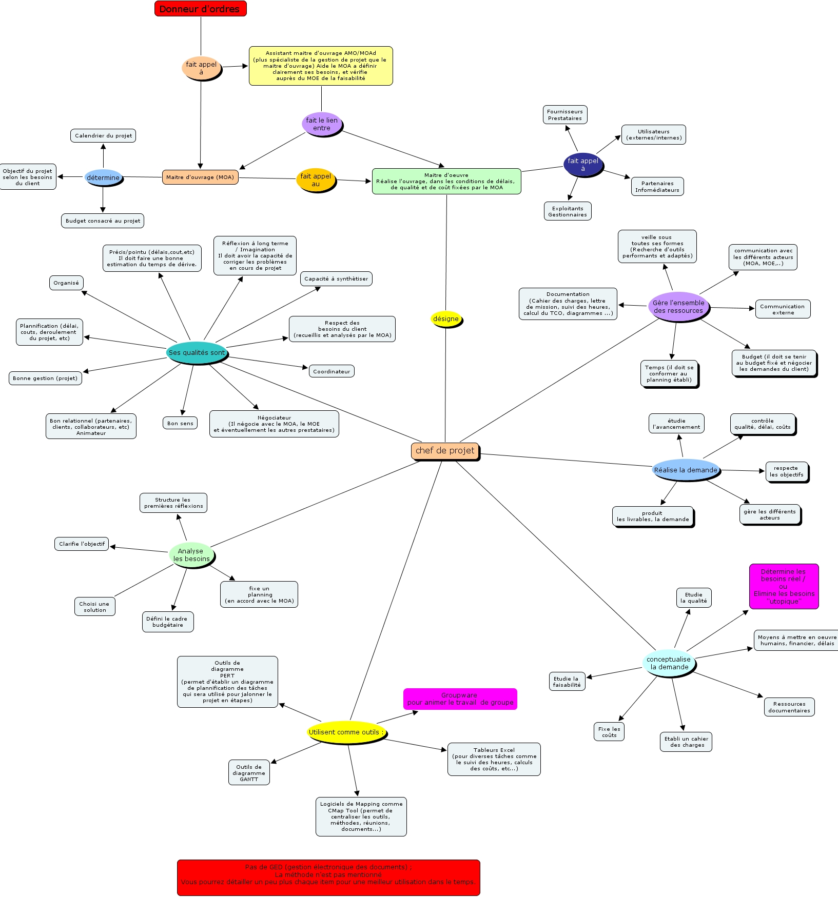 chef de projet G�re l'ensemble des ressources Temps (il doit se conformer au planning �tabli), chef de projet G�re l'ensemble des ressources veille sous toutes ses formes (Recherche d'outils performants et adapt�s), chef de projet G�re l'ensemble des ressources Documentation (Cahier des charges, lettre de mission, suivi des heures, calcul du TCO, diagrammes ...), chef de projet G�re l'ensemble des ressources Communication externe, chef de projet G�re l'ensemble des ressources communication avec les diff�rents acteurs (MOA, MOE,..), chef de projet G�re l'ensemble des ressources Budget (il doit se tenir au budget fix� et n�gocier les demandes du client), Maitre d'ouvrage (MOA) fait appel au Maitre d'oeuvre R�alise l'ouvrage, dans les conditions de d�lais, de qualit� et de co�t fix�es par le MOA, Donneur d'ordres fait appel � Maitre d'ouvrage (MOA), Donneur d'ordres fait appel � Assistant maitre d'ouvrage AMO/MOAd (plus sp�cialiste de la gestion de projet que le maitre d'ouvrage) Aide le MOA a d�finir clairement ses besoins, et v�rifie aupr�s du MOE de la faisabilit�, chef de projet Analyse les besoins Clarifie l'objectif, chef de projet Analyse les besoins D�fini le cadre budg�taire, chef de projet Analyse les besoins Structure les premi�res r�flexions, chef de projet Analyse les besoins fixe un planning (en accord avec le MOA), chef de projet Analyse les besoins Choisi une solution, Maitre d'oeuvre R�alise l'ouvrage, dans les conditions de d�lais, de qualit� et de co�t fix�es par le MOA fait appel � Fournisseurs Prestataires, Maitre d'oeuvre R�alise l'ouvrage, dans les conditions de d�lais, de qualit� et de co�t fix�es par le MOA fait appel � Utilisateurs (externes/internes), Maitre d'oeuvre R�alise l'ouvrage, dans les conditions de d�lais, de qualit� et de co�t fix�es par le MOA fait appel � Partenaires Infom�diateurs, Maitre d'oeuvre R�alise l'ouvrage, dans les conditions de d�lais, de qualit� et de co�t fix�es par le MOA fait appel � Exploitants Gestionnaires, chef de projet conceptualise la demande Etudie la qualit�, chef de projet conceptualise la demande Moyens � mettre en oeuvre humains, financier, d�lais, chef de projet conceptualise la demande D�termine les besoins r�el / ou Elimine les besoins "utopique", chef de projet conceptualise la demande Etabli un cahier des charges, chef de projet conceptualise la demande Ressources documentaires, chef de projet conceptualise la demande Etudie la faisabilit�, chef de projet conceptualise la demande Fixe les co�ts, chef de projet Ses qualit�s sont Coordinateur, chef de projet Ses qualit�s sont R�flexion � long terme / Imagination Il doit avoir la capacit� de corriger les probl�mes en cours de projet, chef de projet Ses qualit�s sont Pr�cis/pointu (d�lais,cout,etc) Il doit faire une bonne estimation du temps de d�rive., chef de projet Ses qualit�s sont Plannification (d�lai, couts, deroulement du projet, etc), chef de projet Ses qualit�s sont Respect des besoins du client (recueillis et analys�s par le MOA), chef de projet Ses qualit�s sont N�gociateur (Il n�gocie avec le MOA, le MOE et �ventuellement les autres prestataires), chef de projet Ses qualit�s sont Bonne gestion (projet), chef de projet Ses qualit�s sont Organis�, chef de projet Ses qualit�s sont Bon sens, chef de projet Ses qualit�s sont Capacit� � synth�tiser, chef de projet Ses qualit�s sont Bon relationnel (partenaires, clients, collaborateurs, etc) Animateur, Assistant maitre d'ouvrage AMO/MOAd (plus sp�cialiste de la gestion de projet que le maitre d'ouvrage) Aide le MOA a d�finir clairement ses besoins, et v�rifie aupr�s du MOE de la faisabilit� fait le lien entre Maitre d'oeuvre R�alise l'ouvrage, dans les conditions de d�lais, de qualit� et de co�t fix�es par le MOA, Assistant maitre d'ouvrage AMO/MOAd (plus sp�cialiste de la gestion de projet que le maitre d'ouvrage) Aide le MOA a d�finir clairement ses besoins, et v�rifie aupr�s du MOE de la faisabilit� fait le lien entre Maitre d'ouvrage (MOA), Maitre d'oeuvre R�alise l'ouvrage, dans les conditions de d�lais, de qualit� et de co�t fix�es par le MOA d�signe chef de projet, chef de projet R�alise la demande respecte les objectifs, chef de projet R�alise la demande g�re les diff�rents acteurs, chef de projet R�alise la demande contr�le qualit�, d�lai, co�ts, chef de projet R�alise la demande �tudie l'avancemement, chef de projet R�alise la demande produit les livrables, la demande, chef de projet Utilisent comme outils : Outils de diagramme PERT (permet d'�tablir un diagramme de plannification des t�ches qui sera utilis� pour jalonner le projet en �tapes), chef de projet Utilisent comme outils : Tableurs Excel (pour diverses t�ches comme le suivi des heures, calculs des co�ts, etc...), chef de projet Utilisent comme outils : Outils de diagramme GANTT, chef de projet Utilisent comme outils : Groupware pour animer le travail de groupe, chef de projet Utilisent comme outils : Logiciels de Mapping comme CMap Tool (permet de centraliser les outils, m�thodes, r�unions, documents...), Maitre d'ouvrage (MOA) d�termine Budget consacr� au projet, Maitre d'ouvrage (MOA) d�termine Objectif du projet selon les besoins du client, Maitre d'ouvrage (MOA) d�termine Calendrier du projet