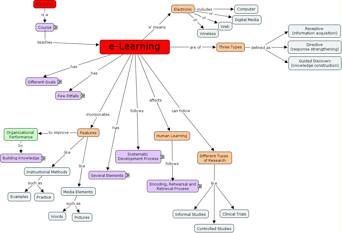 Sri Harsha Kolar (WK3), Instructional Methods such as Examples, EDUC391 is a Course, Selection of Information and Management of working memory, Elements includes (what?) Content, Pitfalls like Failure to accomodate human learning process, Goals like Inform, e-Learning can follow Different Types of Research, Human Learning follows Process, Goals like Perform Principle (far transfer), Content Analysis can be Principle