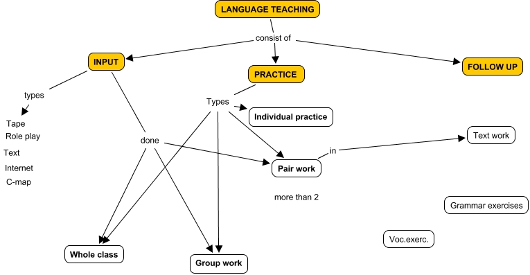 Language teaching, INPUT done Whole class, PRACTICE Types Individual practice, PRACTICE Types Group work, Pair work in Text work, PRACTICE Types Whole class, INPUT done Group work, PRACTICE Types Pair work, LANGUAGE TEACHING consist of INPUT, LANGUAGE TEACHING consist of FOLLOW UP, INPUT types Tape