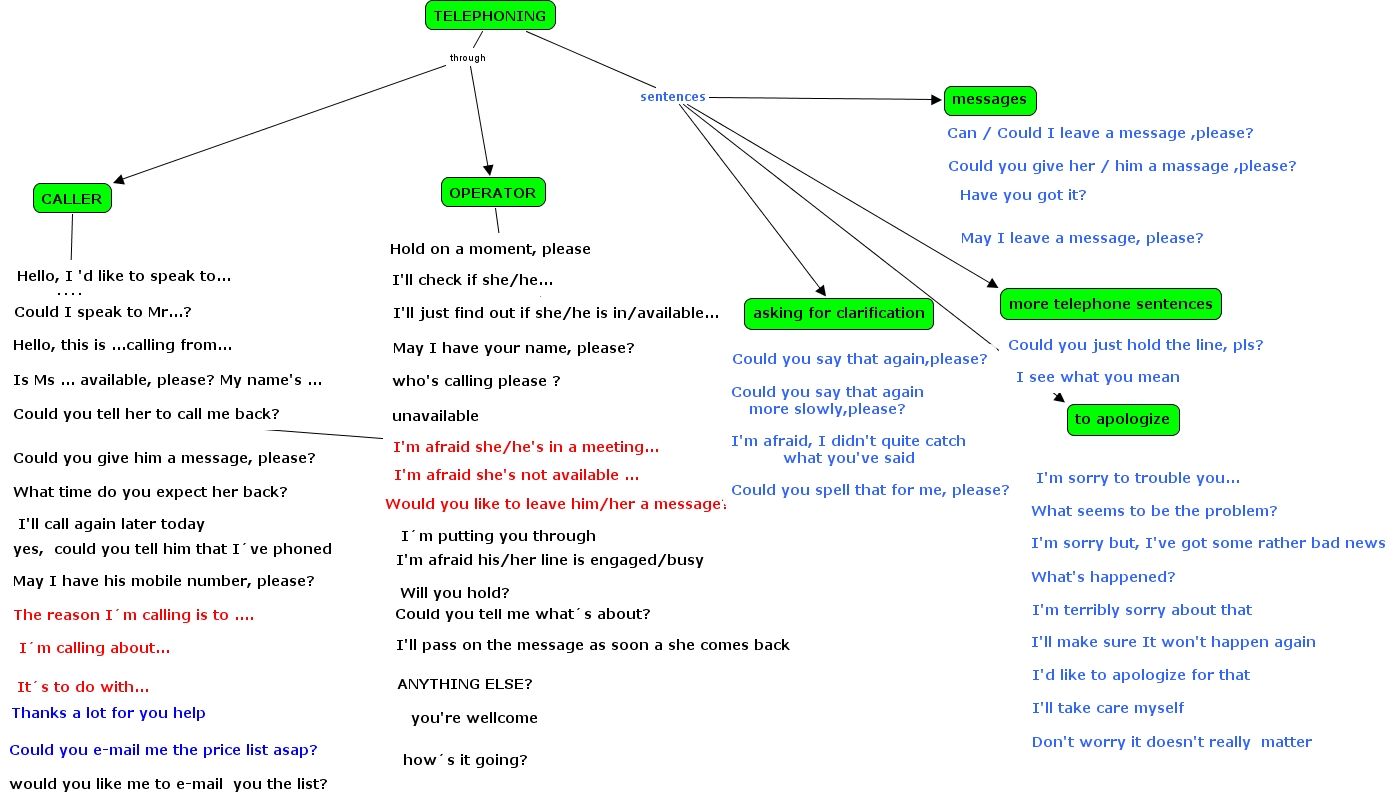 Telephoning, TELEPHONING through CALLER, TELEPHONING sentences more telephone sentences, OPERATOR ???? I'll just find out if she/he is in/available..., TELEPHONING sentences asking for clarification, CALLER ???? Hello, I 'd like to speak to..., OPERATOR ???? I'll just find out if she/he is in/available..., TELEPHONING sentences messages, TELEPHONING sentences to apologize, I'm afraid she/he's in a meeting... ???? Could you tell her to call me back?, TELEPHONING through OPERATOR