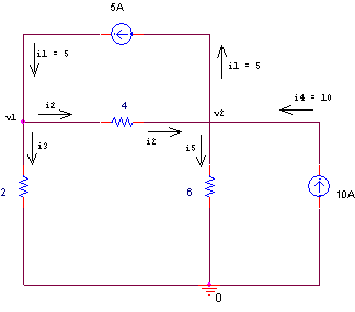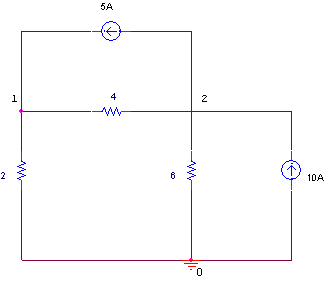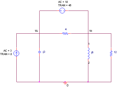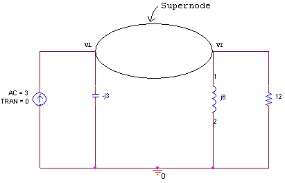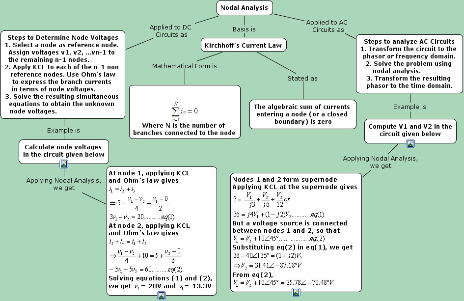 Nodal Analysis, Nodal Analysis Applied to AC Circuits as Steps to analyze AC Circuits 1. Transform the circuit to the phasor or frequency domain. 2. Solve the problem using nodal analysis. 3. Transform the resulting phasor to the time domain., Steps to Determine Node Voltages 1. Select a node as reference node. Assign voltages v1, v2, ...vn-1 to the remaining n-1 nodes. 2. Apply KCL to each of the n-1 non reference nodes. Use Ohm's law to express the branch currents in terms of node voltages. 3. Solve the resulting simultaneous equations to obtain the unknown node voltages. Example is Calculate node voltages in the circuit given below, Calculate node voltages in the circuit given below Applying Nodal Analysis, we get , Kirchhoff's Current Law Mathematical Form is Where N is the number of branches connected to the node, Kirchhoff's Current Law Stated as The algebraic sum of currents entering a node (or a closed boundary) is zero, Nodal Analysis Applied to DC Circuits as Steps to Determine Node Voltages 1. Select a node as reference node. Assign voltages v1, v2, ...vn-1 to the remaining n-1 nodes. 2. Apply KCL to each of the n-1 non reference nodes. Use Ohm's law to express the branch currents in terms of node voltages. 3. Solve the resulting simultaneous equations to obtain the unknown node voltages., Steps to analyze AC Circuits 1. Transform the circuit to the phasor or frequency domain. 2. Solve the problem using nodal analysis. 3. Transform the resulting phasor to the time domain. Example is Compute V1 and V2 in the circuit given below, Compute V1 and V2 in the circuit given below Applying Nodal Analysis, we get , Nodal Analysis Basis is Kirchhoff's Current Law