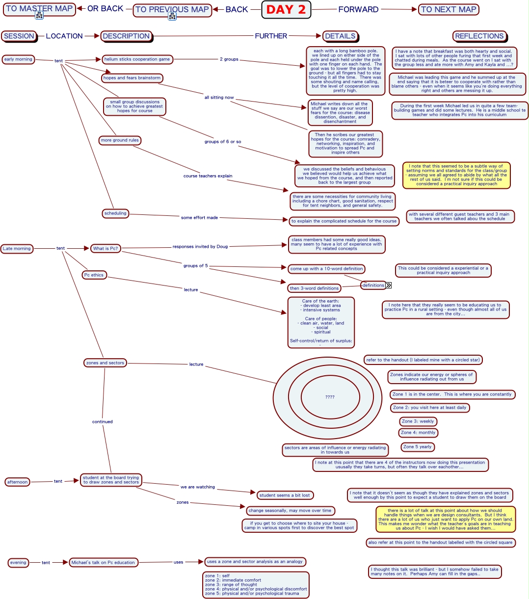 This Concept Map, created with IHMC CmapTools, has information related to: PDC Bullock Day 2, DAY 2 BACK TO PREVIOUS MAP, DAY 2 FORWARD TO NEXT MAP, hopes and fears brainstorm all sitting now Then he scribes our greatest hopes for the course: comradery, networking, inspiration, and motivation to spread Pc and inspire others, evening tent Michael's talk on Pc education, afternoon tent student at the board trying to draw zones and sectors, zones and sectors continued student at the board trying to draw zones and sectors, What is Pc? responses invited by Doug class members had some really good ideas. many seem to have a lot of experience with Pc related concepts, early morning tent small group discussions on how to achieve greatest hopes for course, SESSION LOCATION DESCRIPTION, DAY 2 FORWARD TO NEXT MAP, student at the board trying to draw zones and sectors zones change seasonally, may move over time, early morning tent more ground rules, zones and sectors lecture ????, Michael's talk on Pc education uses uses a zone and sector analysis as an analogy, come up with a 10-word definition defs: "Ethical and wholistic design process for community planning and development" "Designing efficient, systematic relationships for humans and nature to achieve balance and harmony" "Intentional design of synergistic integration between people, plants, animals, structures and living systems" "A desireable system that honor the interrelational and symbiotic nature of all" ", early morning tent hopes and fears brainstorm, SESSION LOCATION DESCRIPTION, then 3-word definitions defs concious, ethical design synergistic system creation designing synergistic abundance practicing value-based efficiency )rather than efficiency-based values) honoring synergistic abundance holistic community design, Late morning tent zones and sectors, What is Pc? groups of 5 then 3-word definitions