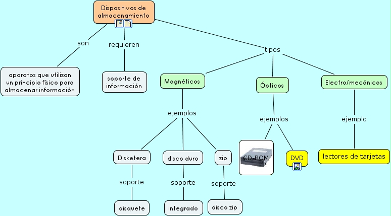 Almacenamiento, Magnéticos ejemplos Disketera, zip soporte disco zip, disco duro soporte integrado, Magnéticos ejemplos disco duro, Disketera soporte disquete, Ópticos ejemplos DVD, Dispositivos de almacenamiento tipos Magnéticos, Dispositivos de almacenamiento requieren soporte de información, Electro/mecánicos ejemplo lectores de tarjetas, Ópticos ejemplos CD-ROM