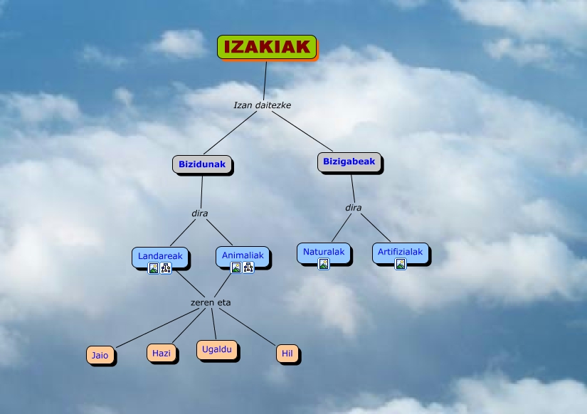 Este Cmap, tiene información relacionada con: izakien sailkapena, Bizidunak dira Landareak, Bizigabeak dira Artifizialak, Landareak zeren eta Jaio, Landareak zeren eta Ugaldu, Animaliak zeren eta Hil, IZAKIAK Izan daitezke Bizigabeak, Bizigabeak dira Naturalak, Animaliak zeren eta Hazi, Animaliak zeren eta Ugaldu, Bizidunak dira Animaliak, IZAKIAK Izan daitezke Bizidunak, Landareak zeren eta Hil, Animaliak zeren eta Jaio, Landareak zeren eta Hazi