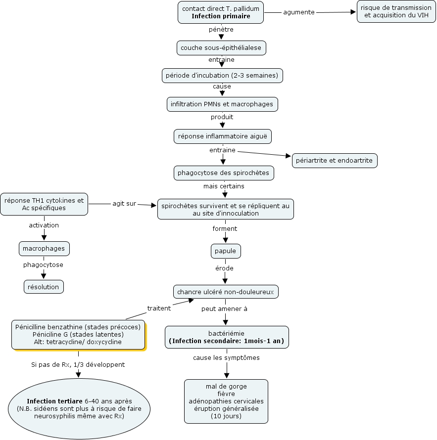 syphilis, Pénicilline benzathine (stades précoces) Péniciline G (stades latentes) Alt: tetracycline/ doxycycline traitent chancre ulcéré non-douleureux, bactériémie (Infection secondaire: 1mois-1 an) cause les symptômes mal de gorge fièvre adénopathies cervicales éruption généralisée (10 jours), réponse TH1 cytokines et Ac spécifiques agit sur spirochètes survivent et se répliquent au au site d'innoculation, réponse TH1 cytokines et Ac spécifiques activation macrophages, contact direct T. pallidum Infection primaire pénètre couche sous-épithélialese, couche sous-épithélialese entraine période d'incubation (2-3 semaines), phagocytose des spirochètes mais certains spirochètes survivent et se répliquent au au site d'innoculation, réponse inflammatoire aiguë entraine périartrite et endoartrite, infiltration PMNs et macrophages produit réponse inflammatoire aiguë, contact direct T. pallidum Infection primaire agumente risque de transmission et acquisition du VIH