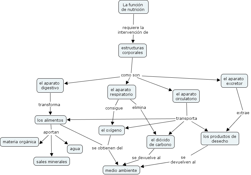 La nutrición, el aparato respiratorio elimina el dióxido de carbono, los alimentos aportan sales minerales, los productos de desecho se devuelven al medio ambiente, los alimentos aportan materia orgánica, estructuras corporales como son el aparato excretor, estructuras corporales como son el aparato circulatorio, La función de nutrición requiere la intervención de estructuras corporales, el aparato circulatorio transporta los alimentos, los alimentos se obtienen del medio ambiente, los alimentos aportan agua