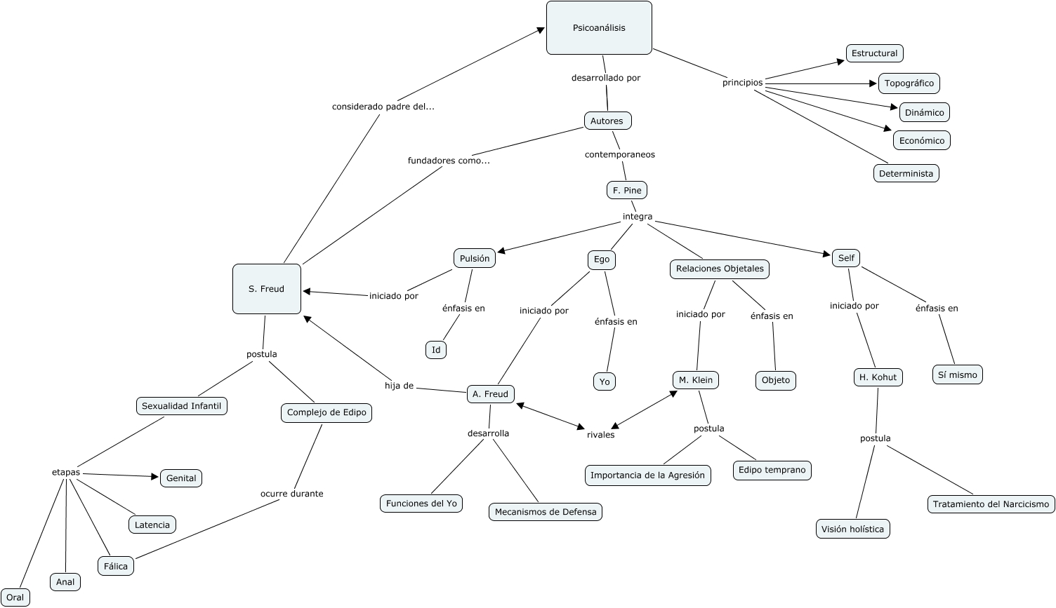Psicoanálisis Contemporáneo, S. Freud considerado padre del... Psicoanálisis, Psicoanálisis desarrollado por Autores, M. Klein postula Importancia de la Agresión, A. Freud desarrolla Funciones del Yo, Psicoanálisis principios Dinámico, F. Pine integra Self, M. Klein postula Edipo temprano, Ego iniciado por A. Freud, Self énfasis en Sí mismo, Sexualidad Infantil etapas Latencia
