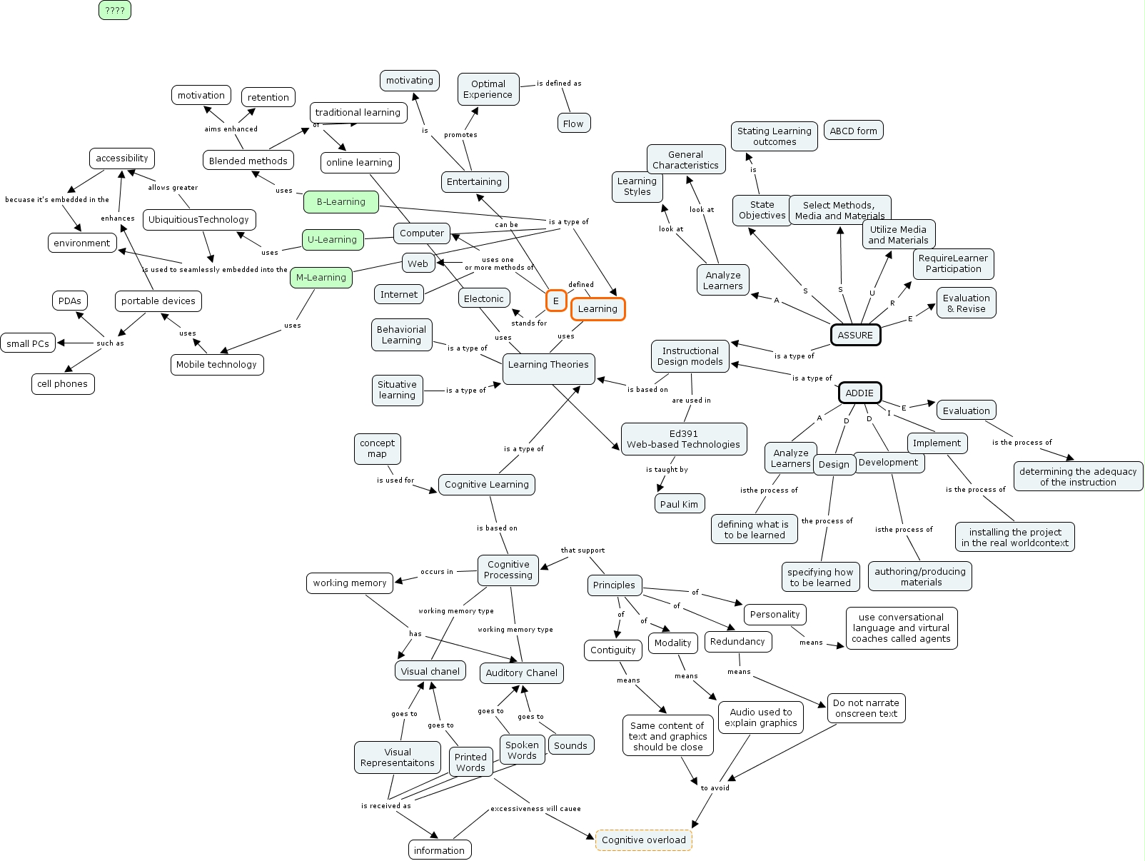 dahwunkim_wk7, ADDIE D Development, Analyze Learners look at General Characteristics, Cognitive Processing occurs in working memory, Situative learning is a type of Learning Theories, Optimal Experience is defined as Flow, Implement is the process of installing the project in the real worldcontext, U-Learning is a type of Learning, B-Learning uses Blended methods, Spoken Words goes to Auditory Chanel, Ed391 Web-based Technologies is taught by Paul Kim