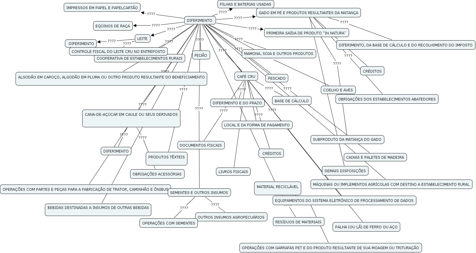 Diferimento, DIFERIMENTO ???? CANA-DE-AÇÚCAR EM CAULE OU SEUS DERIVADOS, CAFÉ CRU ???? DOCUMENTOS FISCAIS, CANA-DE-AÇÚCAR EM CAULE OU SEUS DERIVADOS ???? DIFERIMENTO, DIFERIMENTO ???? PALHA (OU LÃ) DE FERRO OU AÇO, CAFÉ CRU ???? DIFERIMENTO E DO PRAZO, DIFERIMENTO ???? MAMONA, SOJA E OUTROS PRODUTOS, DIFERIMENTO ???? PILHAS E BATERIAS USADAS, DIFERIMENTO ???? MÁQUINAS OU IMPLEMENTOS AGRÍCOLAS COM DESTINO A ESTABELECIMENTO RURAL, DIFERIMENTO ???? GADO EM PÉ E PRODUTOS RESULTANTES DA MATANÇA, DIFERIMENTO ???? FEIJÃO