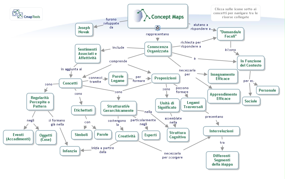 CmapTools - Mappa concettuale della mappa concettuale, Interrelazioni tra Differenti Segmenti della Mappa, Creatività necessaria per scorgere Interrelazioni, Regolarità Percepite o Pattern si formano già nella Infanzia, Strutturati/e Gerarchicamente particolarmente negli Esperti, Conoscenza Organizzata è In Funzione del Contesto, Proposizioni sono Unità di Significato, Conoscenza Organizzata richiesta per rispondere a "Domanda/e Focali", Conoscenza Organizzata necessaria per Insegnamento Efficace, Regolarità Percepite o Pattern negli Eventi (Accadimenti), Conoscenza Organizzata include Sentimenti Associati e Affettività