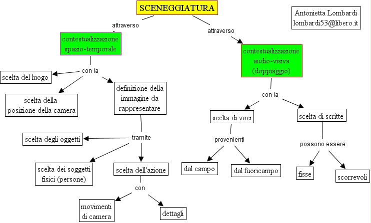 sceneggiatura, definizione della immagine da rappresentare tramite scelta dei soggetti fisici (persone), definizione della immagine da rappresentare tramite scelta degli oggetti, definizione della immagine da rappresentare tramite scelta dei soggetti fisici (persone), scelta di voci provenienti dal fuoricampo, contestualizzazione audio-visiva (doppiaggio) con la scelta di voci, definizione della immagine da rappresentare tramite scelta dell'azione, contestualizzazione spazio-temporale con la scelta della posizione della camera, SCENEGGIATURA attraverso contestualizzazione audio-visiva (doppiaggio), contestualizzazione spazio-temporale con la definizione della immagine da rappresentare, scelta di voci provenienti dal campo