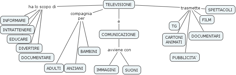 televisione, TELEVISIONE trasmette PUBBLICITA', TELEVISIONE ha lo scopo di DOCUMENTARE, TELEVISIONE ha lo scopo di DOCUMENTARE, TELEVISIONE trasmette TG, TELEVISIONE trasmette SPETTACOLI, TELEVISIONE ha lo scopo di INFORMARE, TELEVISIONE compagnia per BAMBINI, TELEVISIONE compagnia per BAMBINI, TELEVISIONE trasmette CARTONI ANIMATI, TELEVISIONE trasmette DOCUMENTARI