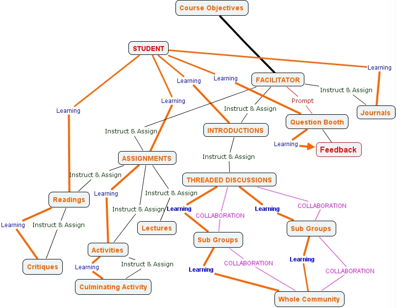 Duane's CMap, FACILITATOR Instruct & Assign ASSIGNMENTS, Sub Groups Learning Whole Community, STUDENT Learning ASSIGNMENTS, Readings Instruct & Assign Critiques, STUDENT Learning Question Booth, THREADED DISCUSSIONS COLLABORATION Sub Groups, ASSIGNMENTS Instruct & Assign Readings, ASSIGNMENTS Instruct & Assign Activities, Sub Groups COLLABORATION Whole Community, FACILITATOR Instruct & Assign Journals
