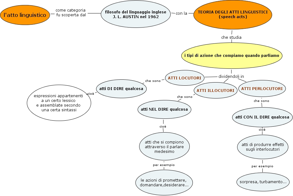 teoria degli atti linguistici, sottomappa di pragmatica uno, i tipi di azione che compiamo quando parliamo dividendoli in ATTI PERLOCUTORI, ATTI ILLOCUTORI che sono atti NEL DIRE qualcosa, filosofo del linguaggio inglese J. L. AUSTIN nel 1962 con la TEORIA DEGLI ATTI LINGUISTICI (speech acts), i tipi di azione che compiamo quando parliamo dividendoli in ATTI LOCUTORI, atti DI DIRE qualcosa cioè espressioni appartenenti a un certo lessico e assemblate secondo una certa sintassi, i tipi di azione che compiamo quando parliamo dividendoli in ATTI ILLOCUTORI, l'atto linguistico come categoria fu scoperta dal filosofo del linguaggio inglese J. L. AUSTIN nel 1962, atti CON IL DIRE qualcosa cioè atti di produrre effetti sugli interlocutori, atti di produrre effetti sugli interlocutori per esempio sorpresa, turbamento..., TEORIA DEGLI ATTI LINGUISTICI (speech acts) che studia i tipi di azione che compiamo quando parliamo