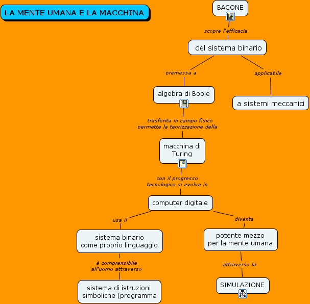 la mente umana e la macchina, sistema binario come proprio linguaggio è comprensibile all'uomo attraverso sistema di istruzioni simboliche (programma, macchina di Turing con il progresso tecnologico si evolve in computer digitale, BACONE scopre l'efficacia del sistema binario, computer digitale diventa potente mezzo per la mente umana, del sistema binario premessa a algebra di Boole, potente mezzo per la mente umana attraverso la SIMULAZIONE, algebra di Boole trasferita in campo fisico permette la teorizzazione della macchina di Turing, del sistema binario applicabile a sistemi meccanici, computer digitale usa il sistema binario come proprio linguaggio
