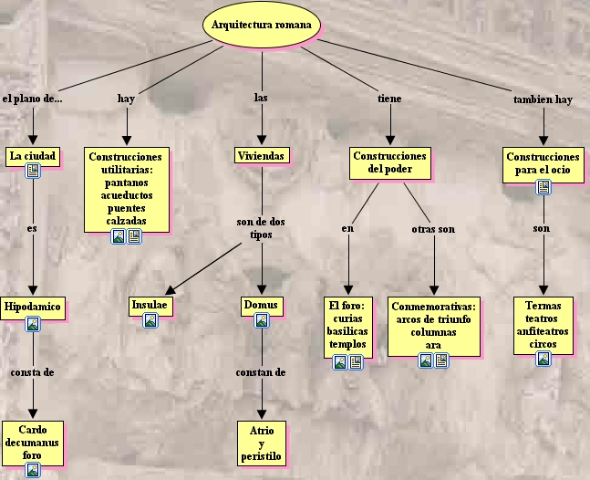 index, Arquitectura romana tiene Construcciones del poder, Viviendas son de dos tipos Insulae, Viviendas son de dos tipos Domus, Construcciones para el ocio son Termas teatros anfiteatros circos, Arquitectura romana el plano de... La ciudad, Arquitectura romana hay Construcciones utilitarias: pantanos acueductos puentes calzadas, Construcciones del poder en El foro: curias basilicas templos, La ciudad es Hipodamico, Arquitectura romana tambien hay Construcciones para el ocio, Hipodamico consta de Cardo decumanus foro