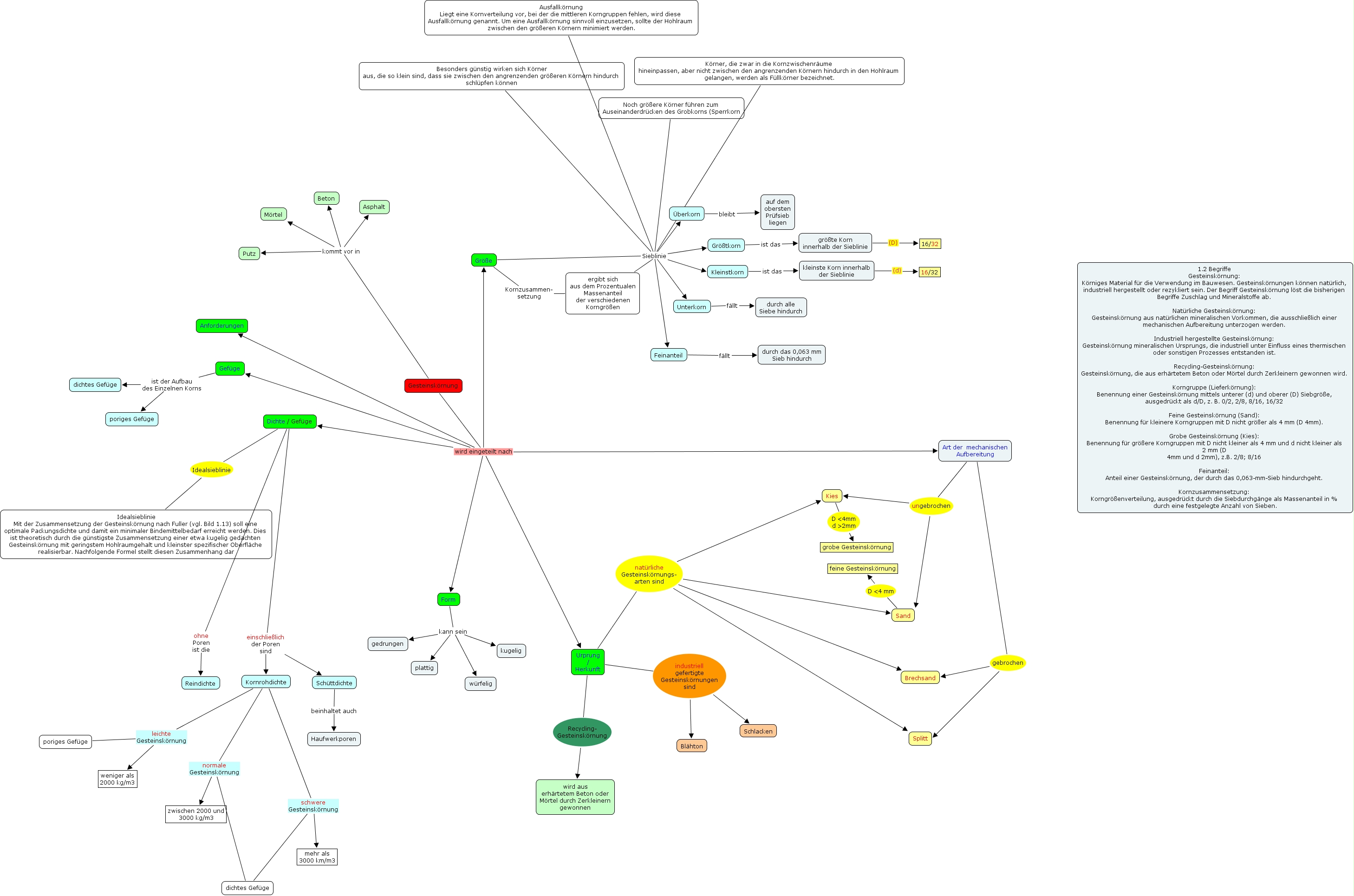 gesteinskörnung, Urprung / Herkunft natürliche Gesteinskörnungs- arten sind Kies, ergibt sich aus dem Prozentualen Massenanteil der verschiedenen Korngrößen Sieblinie Unterkorn, größte Korn innerhalb der Sieblinie (D) 16/32, Größe Sieblinie Feinanteil, Unterkorn fällt durch alle Siebe hindurch, Urprung / Herkunft natürliche Gesteinskörnungs- arten sind Splitt, Gesteinskörnung kommt vor in Asphalt, Gesteinskörnung wird eingeteilt nach Art der mechanischen Aufbereitung, Kornrohdichte leichte Gesteinskörnung poriges Gefüge, Urprung / Herkunft industriell gefertigte Gesteinskörnungen sind Blähton