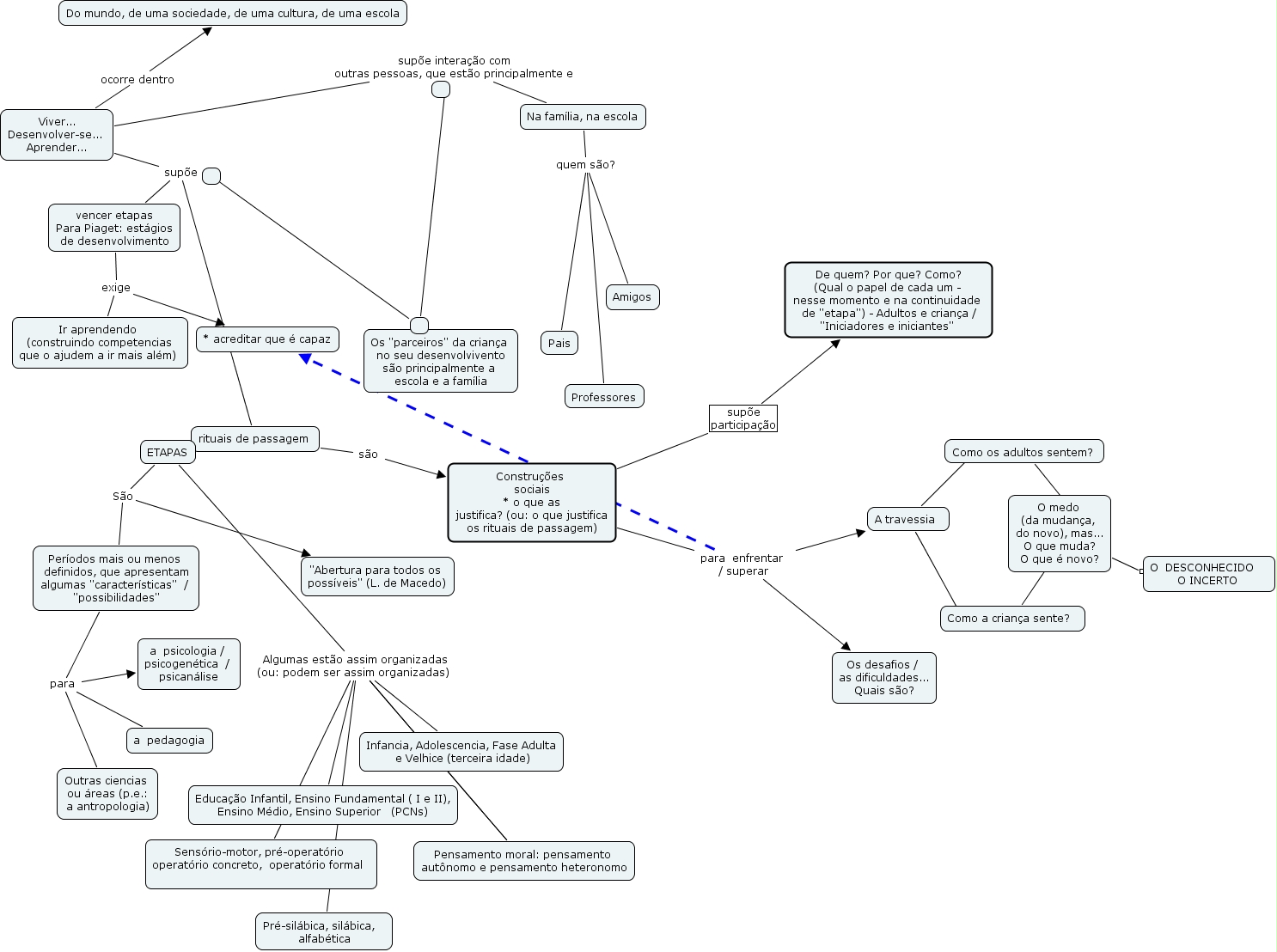 Viver... Desenvolver-se, A travessia Como a criança sente?, Construções sociais * o que as justifica? (ou: o que justifica os rituais de passagem) para enfrentar / superar A travessia, ETAPAS Algumas estão assim organizadas (ou: podem ser assim organizadas) Pensamento moral: pensamento autônomo e pensamento heteronomo, ETAPAS Algumas estão assim organizadas (ou: podem ser assim organizadas) Pensamento moral: pensamento autônomo e pensamento heteronomo, Viver... Desenvolver-se... Aprender... supõe rituais de passagem, ETAPAS Algumas estão assim organizadas (ou: podem ser assim organizadas) Pré-silábica, silábica, alfabética, O medo (da mudança, do novo), mas... O que muda? O que é novo? O DESCONHECIDO O INCERTO, ETAPAS São "Abertura para todos os possíveis" (L. de Macedo), A travessia Como os adultos sentem?, vencer etapas Para Piaget: estágios de desenvolvimento exige Ir aprendendo (construindo competencias que o ajudem a ir mais além)