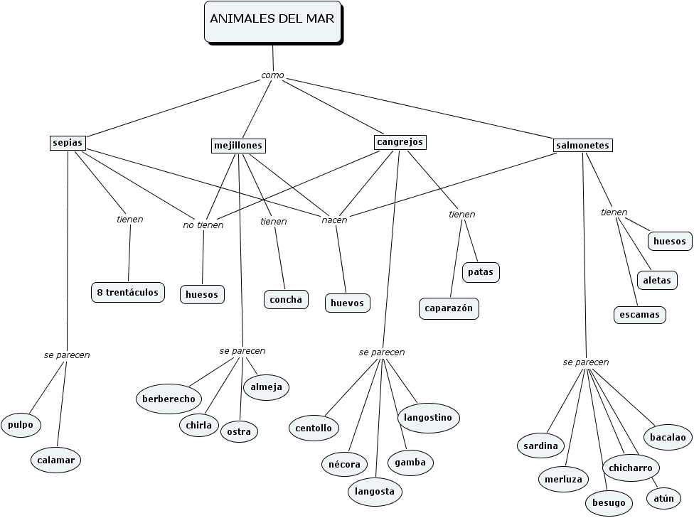 sepias se parecen calamar, sepias se parecen pulpo, salmonetes se parecen merluza, salmonetes se parecen at�n, salmonetes se parecen chicharro, salmonetes se parecen besugo, salmonetes se parecen sardina, salmonetes se parecen bacalao, mejillones se parecen almeja, mejillones se parecen berberecho, mejillones se parecen ostra, mejillones se parecen chirla, salmonetes tienen aletas, salmonetes tienen huesos, salmonetes tienen escamas, mejillones no tienen huesos, salmonetes nacen huevos, cangrejos se parecen langostino, cangrejos se parecen centollo, cangrejos se parecen n�cora, cangrejos se parecen langosta, cangrejos se parecen gamba, cangrejos nacen huevos, sepias tienen 8 trent�culos, sepias nacen huevos, mejillones tienen concha, mejillones nacen huevos, sepias no tienen huesos, cangrejos no tienen huesos, cangrejos tienen caparaz�n, cangrejos tienen patas, ANIMALES DEL MAR como sepias, ANIMALES DEL MAR como cangrejos, ANIMALES DEL MAR como salmonetes, ANIMALES DEL MAR como mejillones
