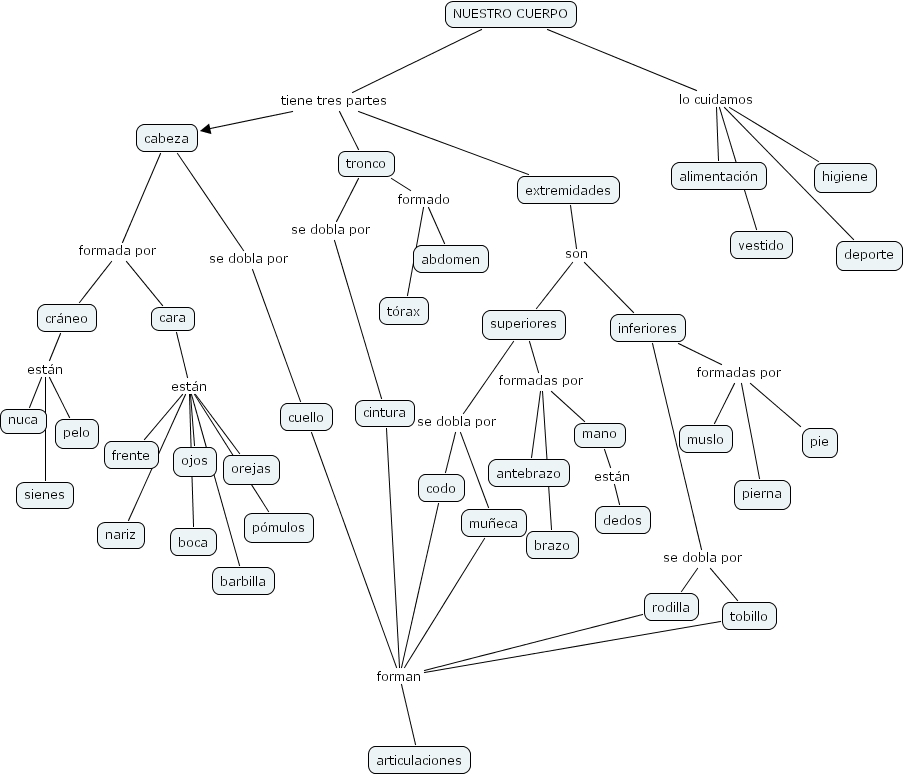superiores se dobla por codo, superiores se dobla por mu�eca, cr�neo est�n sienes, cr�neo est�n pelo, cr�neo est�n nuca, cara est�n ojos, cara est�n nariz, cara est�n orejas, cara est�n barbilla, cara est�n boca, cara est�n frente, cara est�n p�mulos, rodilla forman cuello, mu�eca forman cuello, cabeza formada por cara, cabeza formada por cr�neo, NUESTRO CUERPO lo cuidamos vestido, NUESTRO CUERPO lo cuidamos deporte, NUESTRO CUERPO lo cuidamos higiene, NUESTRO CUERPO lo cuidamos alimentaci�n, tronco formado t�rax, tronco formado abdomen, inferiores formadas por pie, inferiores formadas por pierna, inferiores formadas por muslo, mano est�n dedos, NUESTRO CUERPO tiene tres partes tronco, NUESTRO CUERPO tiene tres partes extremidades, NUESTRO CUERPO tiene tres partes cabeza, tobillo forman cuello, cintura forman cuello, cabeza se dobla por cuello, superiores formadas por antebrazo, superiores formadas por mano, superiores formadas por brazo, articulaciones forman cuello, extremidades son superiores, extremidades son inferiores, codo forman cuello, inferiores se dobla por tobillo, inferiores se dobla por rodilla, tronco se dobla por cintura