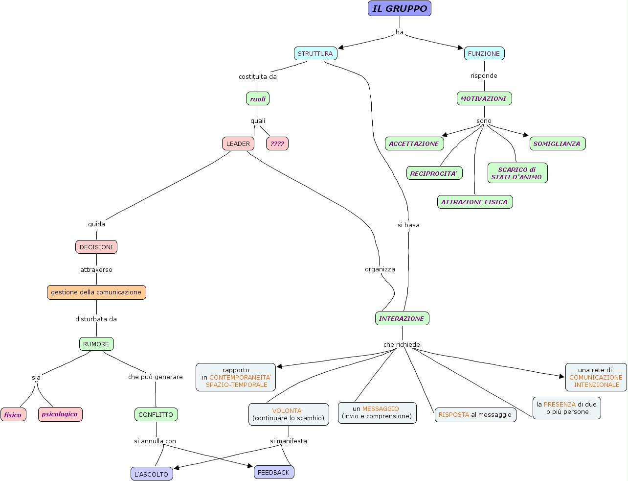 Mappa Generale Bussolin Bazzea, gestione della comunicazione disturbata da RUMORE, RUMORE sia psicologico, INTERAZIONE che richiede VOLONTA' (continuare lo scambio), RUMORE che può generare CONFLITTO, VOLONTA' (continuare lo scambio) si manifesta L'ASCOLTO, VOLONTA' (continuare lo scambio) si manifesta FEEDBACK, MOTIVAZIONI sono ACCETTAZIONE, STRUTTURA costituita da ruoli, FUNZIONE risponde MOTIVAZIONI, DECISIONI attraverso gestione della comunicazione