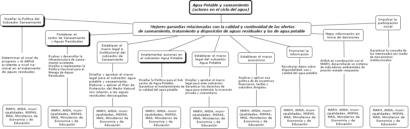 estrategia12, Establecer el marco económico Analizar y aplicar una política de de incentivos financieros, tarifas y subsidios dirigidos. MARN, ANDA, muni- cipalidades, MSPAS, MAG, Ministerios de Economía y de Educación, Mejores garantías relacionadas con la calidad y continuidad de las ofertas de saneamiento, tratamiento y disposición de aguas residuales y las de agua potable ???? Establecer el marco legal e Institucional del subsector de Saneamiento, Mejores garantías relacionadas con la calidad y continuidad de las ofertas de saneamiento, tratamiento y disposición de aguas residuales y las de agua potable ???? Diseñar la Política del Subsector Saneamiento, Establecer el marco legal e Institucional del subsector de Saneamiento Diseñar y aprobar el marco legal para el subsector agua potable y saneamiento. Elaborar y aplicar el Plan de Protección del Medio Natural con relación a las aguas residuales descargadas. MARN, ANDA, muni- cipalidades, MSPAS, MAG, Ministerios de Economía y de Educación, Promover la información Recolectar datos sobre disponibilidad, uso y calidad del agua potable MARN, ANDA, muni- cipalidades, MSPAS, MAG, Ministerios de Economía y de Educación, Fortalecer el sector de Saneamiento y Aguas Residuales Evaluar y desarrollar la infraestructura de sanea- miento existente. Diseñar e implementar la Política Nacional para el Manejo de Aguas Residuales MARN, ANDA, muni- cipalidades, MSPAS, MAG, Ministerios de Economía y de Educación, Diseñar la Política del Subsector Saneamiento Determinar el nivel de progreso y el déficit existente a nivel na- cional en el tratamiento de aguas residuales MARN, ANDA, muni- cipalidades, MSPAS, MAG, Ministerios de Economía y de Educación, Mejores garantías relacionadas con la calidad y continuidad de las ofertas de saneamiento, tratamiento y disposición de aguas residuales y las de agua potable ???? Impulsar la participación social, Implementar acciones en el subsector Agua Potable Diseñar la Política para el Sub sector de Agua Potable. Garantizar el mantenimiento de la calidad del agua potable MARN, ANDA, muni- cipalidades, MSPAS, MAG, Ministerios de Economía y de Educación, Mejores garantías relacionadas con la calidad y continuidad de las ofertas de saneamiento, tratamiento y disposición de aguas residuales y las de agua potable ???? Establecer el marco económico