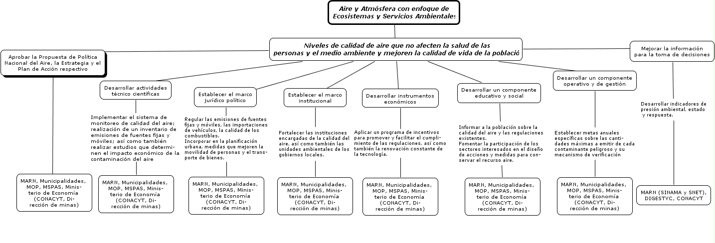 estrategia4, Niveles de calidad de aire que no afecten la salud de las personas y el medio ambiente y mejoren la calidad de vida de la población ???? Desarrollar un componente operativo y de gestión, Niveles de calidad de aire que no afecten la salud de las personas y el medio ambiente y mejoren la calidad de vida de la población ???? Establecer el marco institucional, Mejorar la información para la toma de decisiones Desarrollar indicadores de presión ambiental, estado y respuesta. MARN (SINAMA y SNET), DIGESTYC, CONACYT, Niveles de calidad de aire que no afecten la salud de las personas y el medio ambiente y mejoren la calidad de vida de la población ???? Desarrollar instrumentos económicos, Niveles de calidad de aire que no afecten la salud de las personas y el medio ambiente y mejoren la calidad de vida de la población ???? Establecer el marco jurídico político, Niveles de calidad de aire que no afecten la salud de las personas y el medio ambiente y mejoren la calidad de vida de la población ???? Aprobar la Propuesta de Política Nacional del Aire, la Estrategia y el Plan de Acción respectivo, Establecer el marco institucional Fortalecer las instituciones encargadas de la calidad del aire, así como también las unidades ambientales de los gobiernos locales. MARN, Municipalidades, MOP, MSPAS, Minis- terio de Economía (CONACYT, Di- rección de minas), Niveles de calidad de aire que no afecten la salud de las personas y el medio ambiente y mejoren la calidad de vida de la población ???? Desarrollar actividades técnico científicas, Niveles de calidad de aire que no afecten la salud de las personas y el medio ambiente y mejoren la calidad de vida de la población ???? Establecer el marco jurídico político, Niveles de calidad de aire que no afecten la salud de las personas y el medio ambiente y mejoren la calidad de vida de la población ???? Aprobar la Propuesta de Política Nacional del Aire, la Estrategia y el Plan de Acción respectivo
