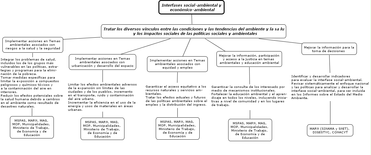 estrategia14, Tratar los diversos vínculos entre las condiciones y las tendencias del ambiente y la sa lud, y los impactos sociales de las políticas sociales y ambientales ???? Mejorar la información, participación y acceso a la justicia en temas ambientales y educación ambiental, Mejorar la información, participación y acceso a la justicia en temas ambientales y educación ambiental Garantizar la consulta de los interesado por medio de mecanismos institucionales. Fortalecer la educación ambiental y el apren- dizaje en todos los niveles, incluyendo inicia- tivas a nivel de comunidad y en los lugares de trabajo. MSPAS, MARN, MAG, MOP, Municipalidades, Ministerio de Trabajo, de Economía y de Educación, Mejorar la información, participación y acceso a la justicia en temas ambientales y educación ambiental Garantizar la consulta de los interesado por medio de mecanismos institucionales. Fortalecer la educación ambiental y el apren- dizaje en todos los niveles, incluyendo inicia- tivas a nivel de comunidad y en los lugares de trabajo. MSPAS, MARN, MAG, MOP, Municipalidades, Ministerio de Trabajo, de Economía y de Educación, Tratar los diversos vínculos entre las condiciones y las tendencias del ambiente y la sa lud, y los impactos sociales de las políticas sociales y ambientales ???? Implementar acciones en Temas ambientales asociados con equidad y empleo, Implementar acciones en Temas ambientales asociados con urbanización y desarrollo del espacio Limitar los efectos ambientales adversos de la expansión sin límites de las ciudades y de los pueblos, incremento en el transporte, ruido y contaminación del aire urbano. Incrementar la eficiencia en el uso de la energía y usos de materiales en áreas urbanas. MSPAS, MARN, MAG, MOP, Municipalidades, Ministerio de Trabajo, de Economía y de Educación, Tratar los diversos vínculos entre las condiciones y las tendencias del ambiente y la sa lud, y los impactos sociales de las políticas sociales y ambientales ???? Implementar acciones en Temas ambientales asociados con riesgos a la salud y la seguridad, Implementar acciones en Temas ambientales asociados con riesgos a la salud y la seguridad Integrar los problemas de salud, incluidos los de los grupos más vulnerables en las políticas, estra- tegias y programas para la elimi- nación de la pobreza. Tomar medidas específicas para limitar la exposición a compuestos peligrosos y químicos tóxicos y a la contaminación del aire en interiores. Reducir los efectos potenciales sobre la salud humana debido a cambios en el ambiente como resultado de desastres naturales. MSPAS, MARN, MAG, MOP, Municipalidades, Ministerio de Trabajo, de Economía y de Educación, Tratar los diversos vínculos entre las condiciones y las tendencias del ambiente y la sa lud, y los impactos sociales de las políticas sociales y ambientales ???? Mejorar la información para la toma de decisiones, Mejorar la información para la toma de decisiones Identificar y desarrollar indicadores para evaluar la interfase social-ambiental. Revisar sistemáticamente el enfoque nacional y las políticas para analizar y desarrollar la interfase social-ambiental, para ser incluida en los Informes sobre el Estado del Medio Ambiente. MARN (SINAMA y SNET), DIGESTYC, CONACYT, Interfases social-ambiental y económico-ambiental ???? Tratar los diversos vínculos entre las condiciones y las tendencias del ambiente y la sa lud, y los impactos sociales de las políticas sociales y ambientales